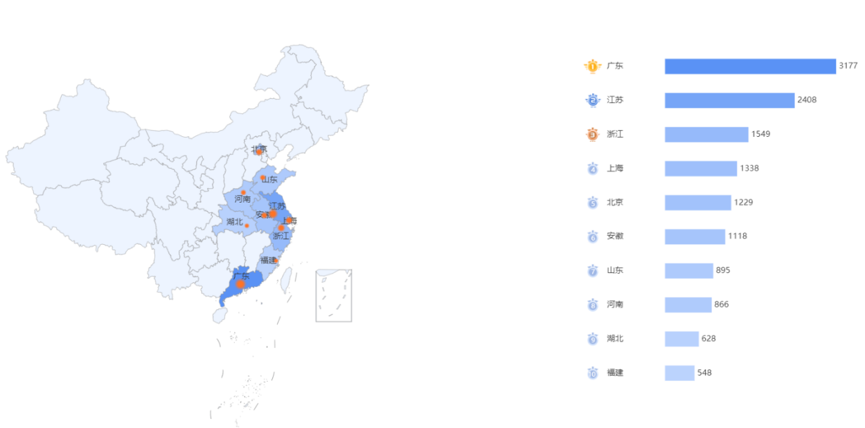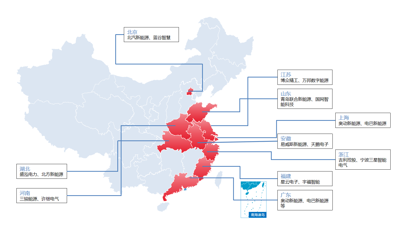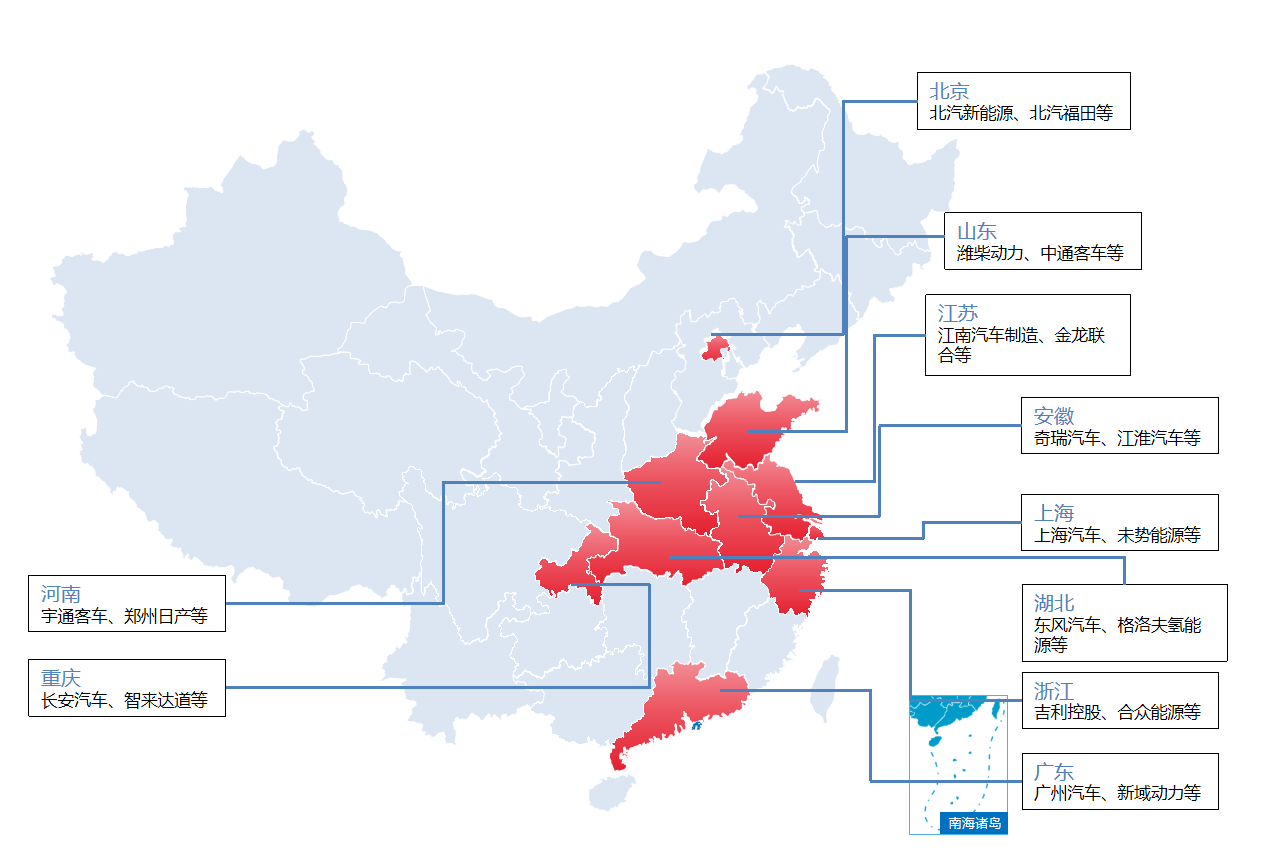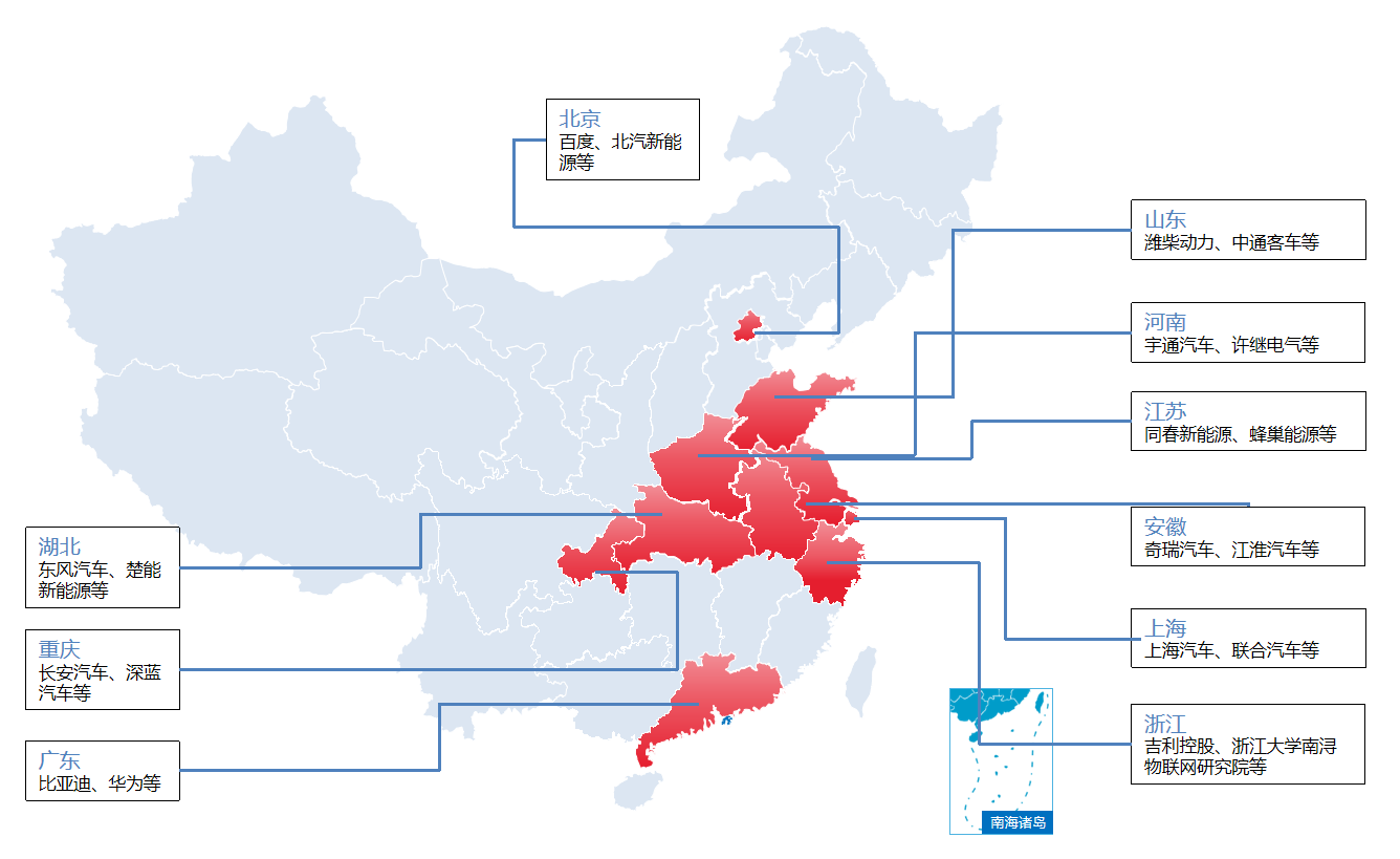新能源汽车整车制造的主要企业有比亚迪、广汽集团、小鹏汽车、蔚来汽车等。比亚迪和广汽集团是传统车企转型的新能源汽车制造商,而蔚来汽车和小鹏汽车则是由互联网公司转型到新能源汽车行业的新能源汽车制造商。从新能源汽车整车制造企业分布情况来看,广东和上海代表性企业较多,同时北京、安徽、重庆、河北代表性企业也相对较多,如北汽蓝谷、江淮汽车、长安汽车等。