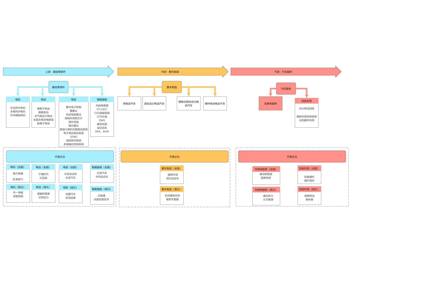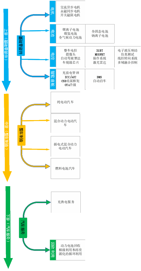 新能源汽车整体产业链划分为上游的核心零部件,包括动力电池、氢燃料电池、电机及电控系统以及传统汽车零部件;中游的整车制造,包括纯电动汽车、油电混合动力汽车、燃料电池汽车、增程式电动汽车;下游的汽车服务,包括充换电服务和汽车后市场。