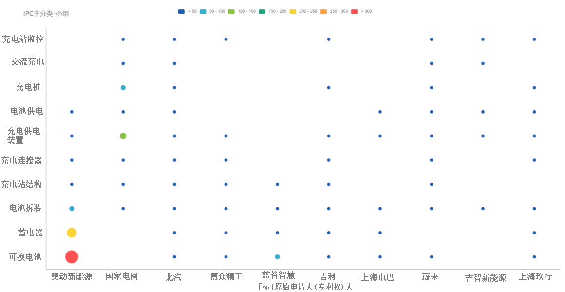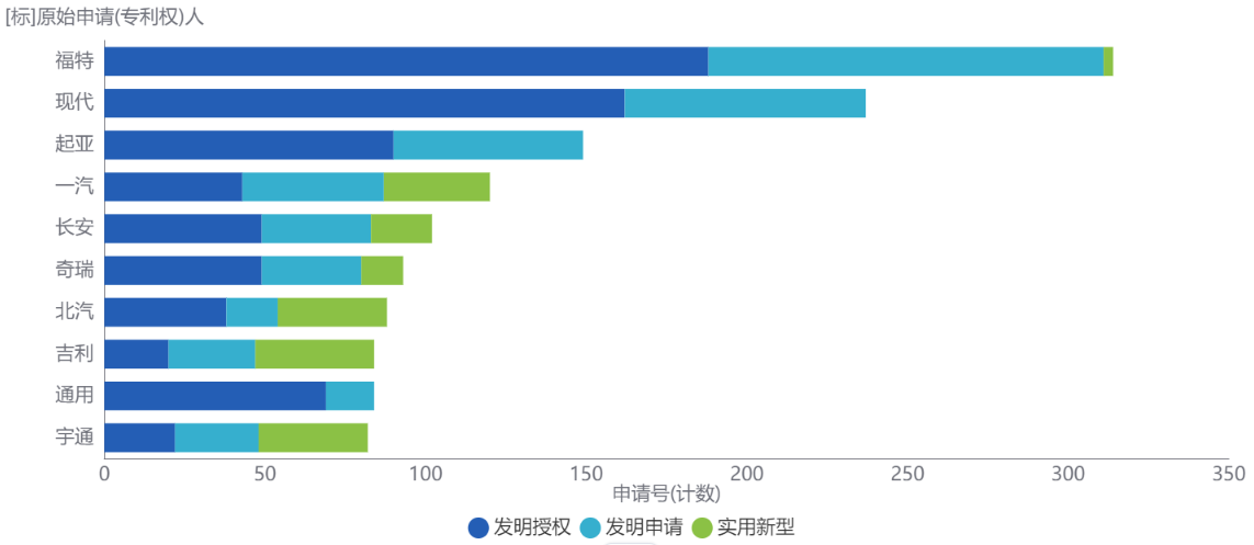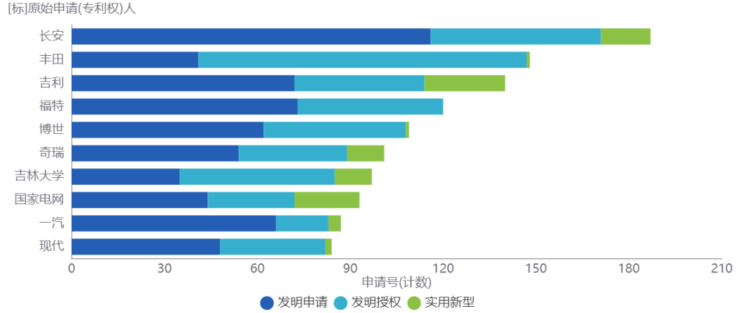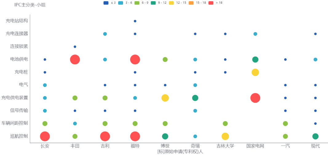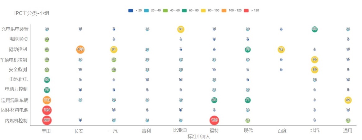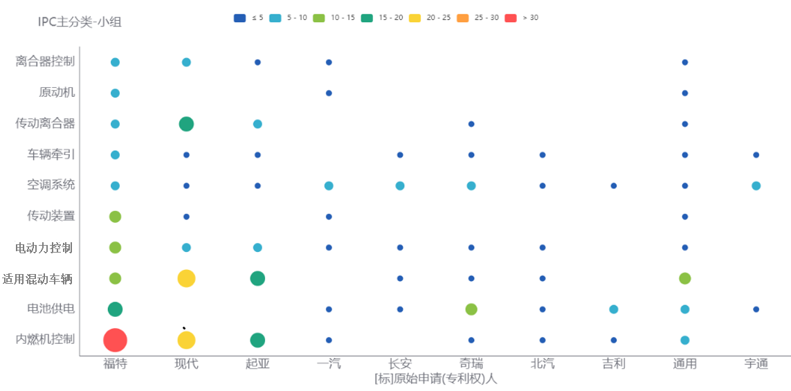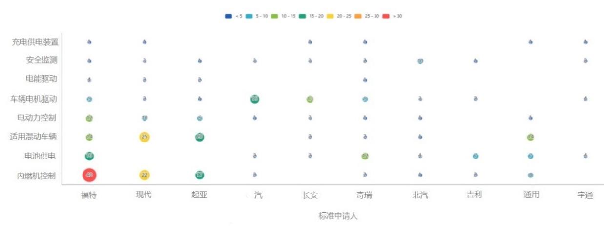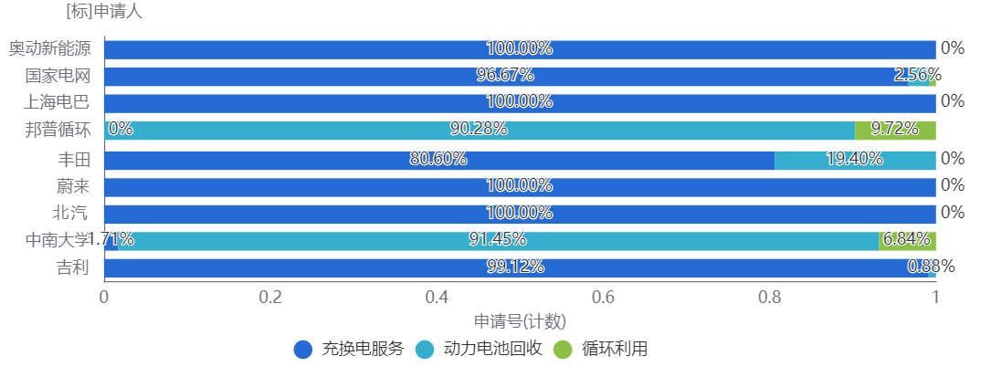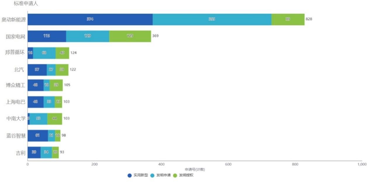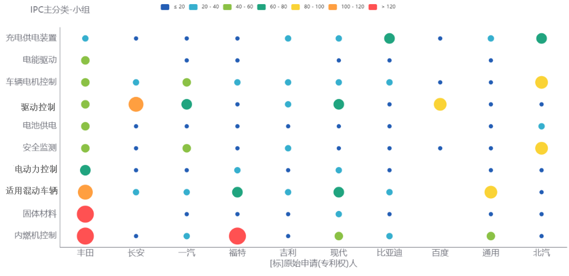 6、从申请总量分布上,上游专利技术主要申请人为丰田、长安、一汽、吉利、比亚迪;中游专利技术主要申请人为福特、现代、起亚、一汽、长安;下游专利技术主要申请人为奥动新能源、国家电网、邦普循环、北京新能源、博众精工。上中下游相关技术的专利申请技术集中度较低,各个厂商现阶段均以自身主要技术产品为向导进行系列布局,并没有具有绝对技术领先或占据绝对技术优势/专利优势的企业存在。