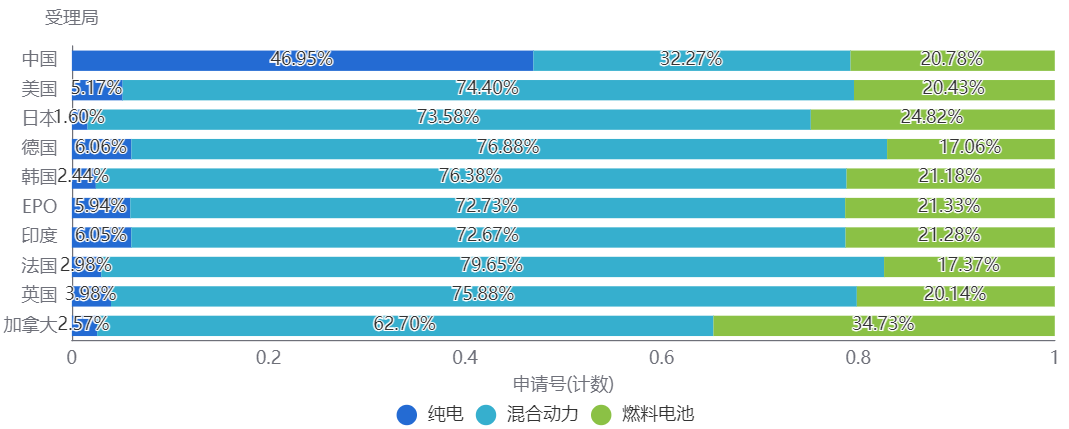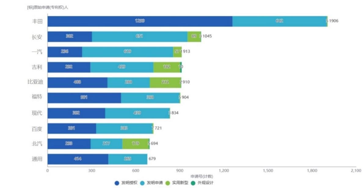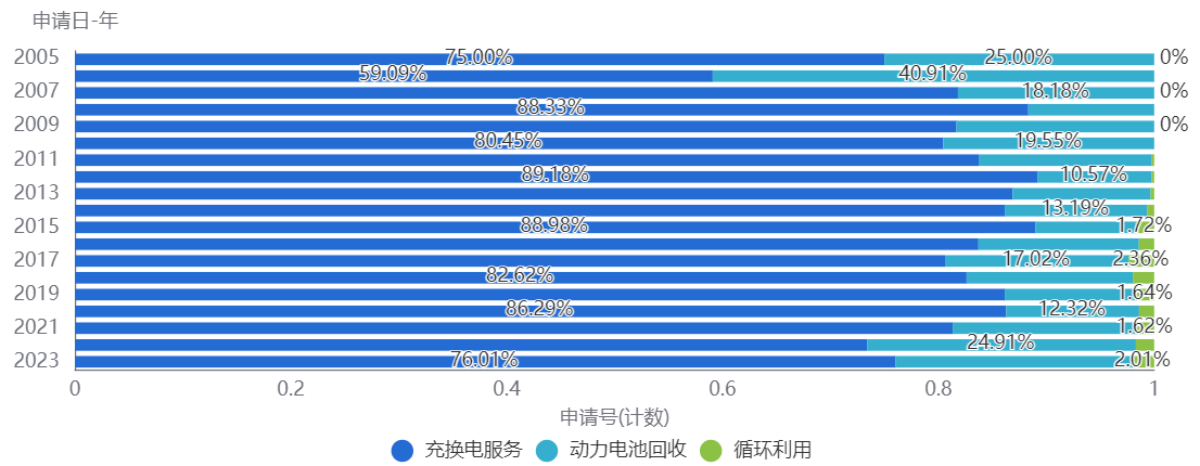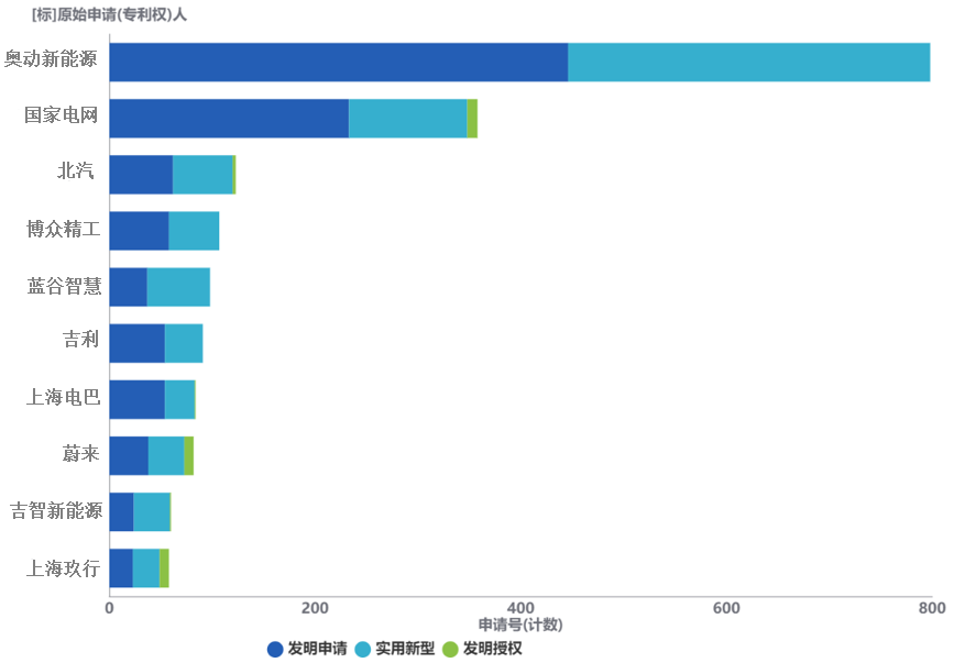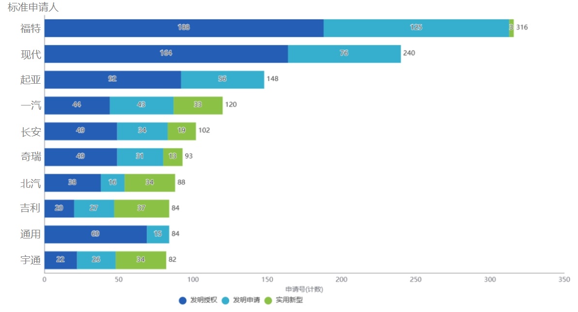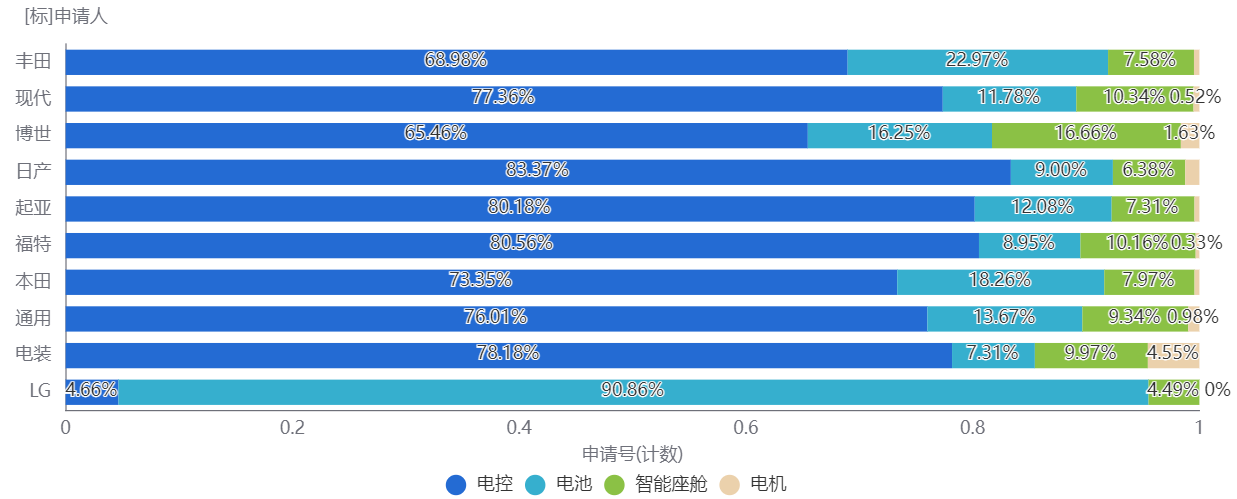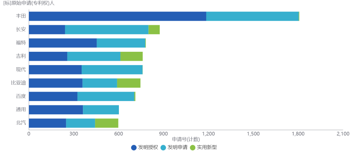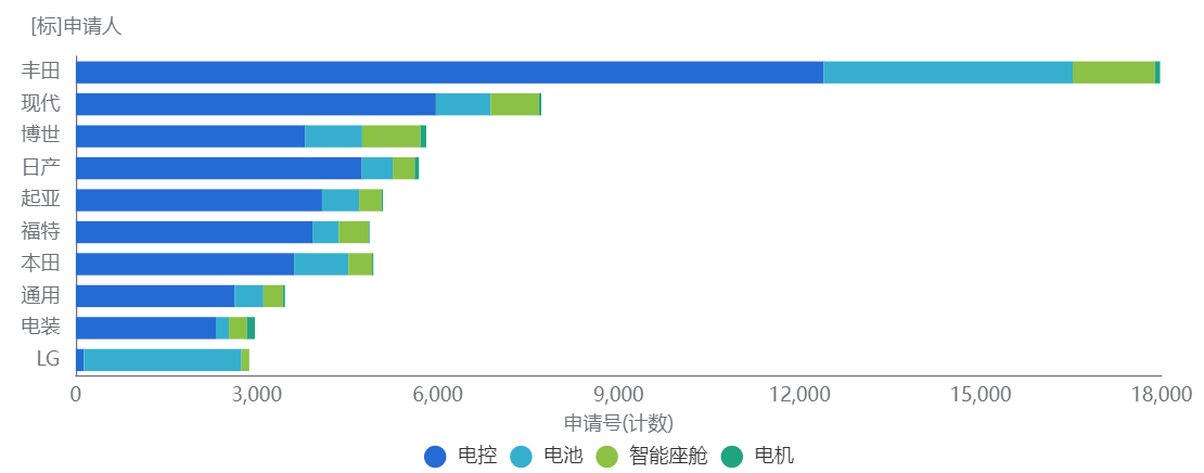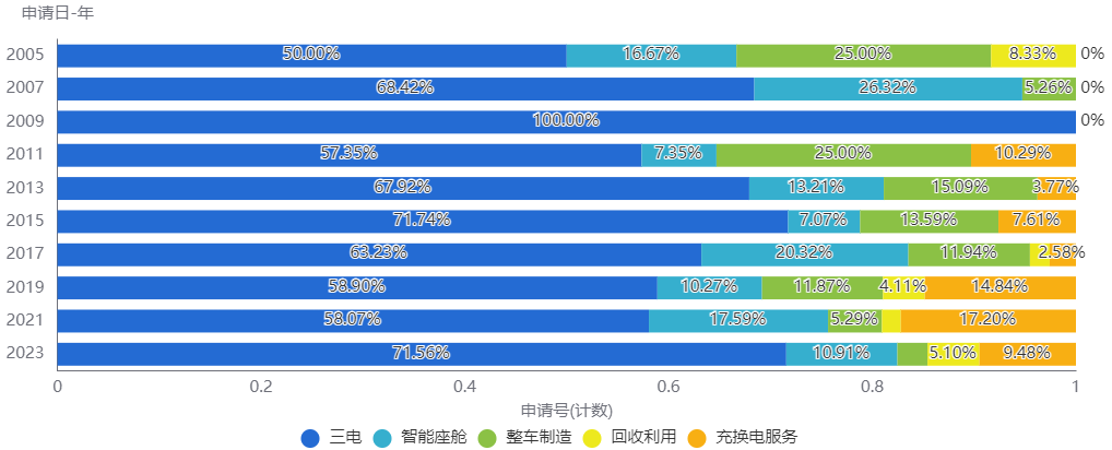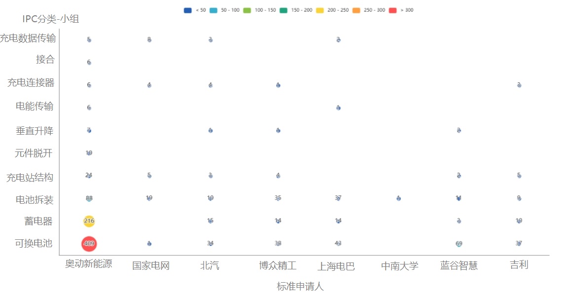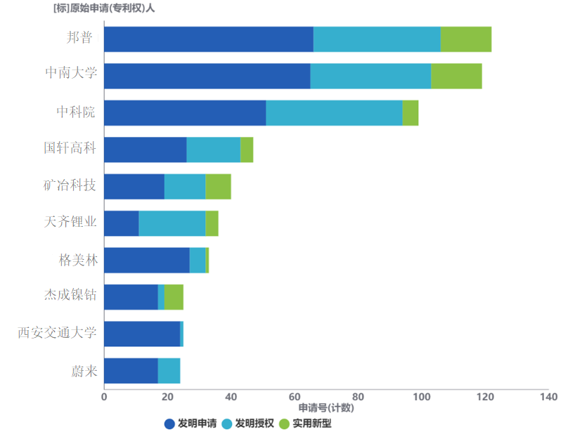 6、从申请总量分布上,上游专利技术主要申请人为丰田、长安、一汽、吉利、比亚迪;中游专利技术主要申请人为福特、现代、起亚、一汽、长安;下游专利技术主要申请人为奥动新能源、国家电网、邦普循环、北京新能源、博众精工。上中下游相关技术的专利申请技术集中度较低,各个厂商现阶段均以自身主要技术产品为向导进行系列布局,并没有具有绝对技术领先或占据绝对技术优势/专利优势的企业存在。