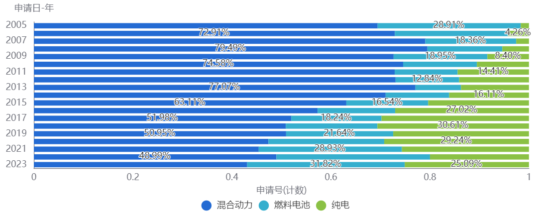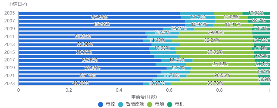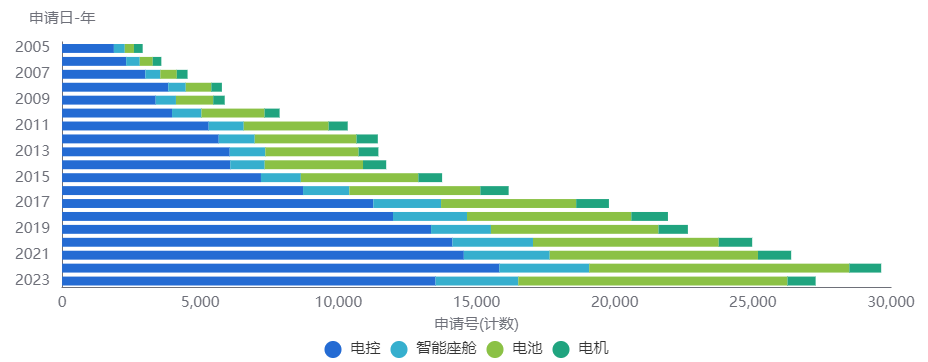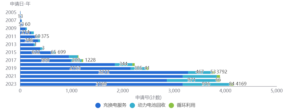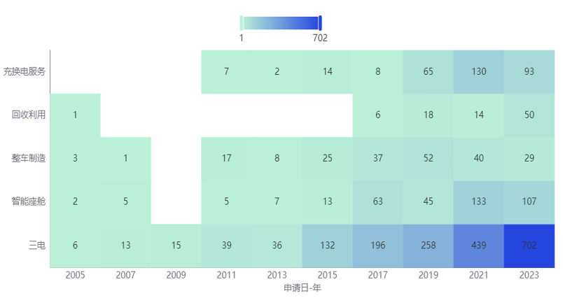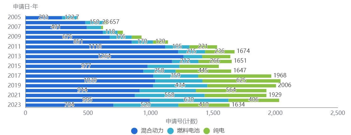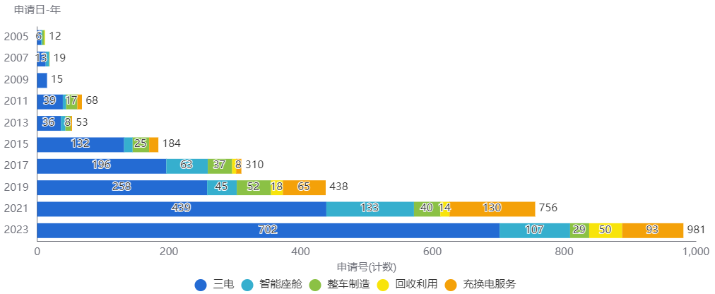 1、新能源汽车产业链的专利申请量在过去几年中持续增长,涵盖了上游的核心零部件(如动力电池、氢燃料电池、电机及电控系统)、中游的整车制造(包括纯电动汽车、油电混合动力汽车等)以及下游的汽车服务(充换电服务和动力电池回收)。截至2023年,中国新能源汽车产业的专利申请总量已达到269316件,授权专利198345件,有效专利134311件。