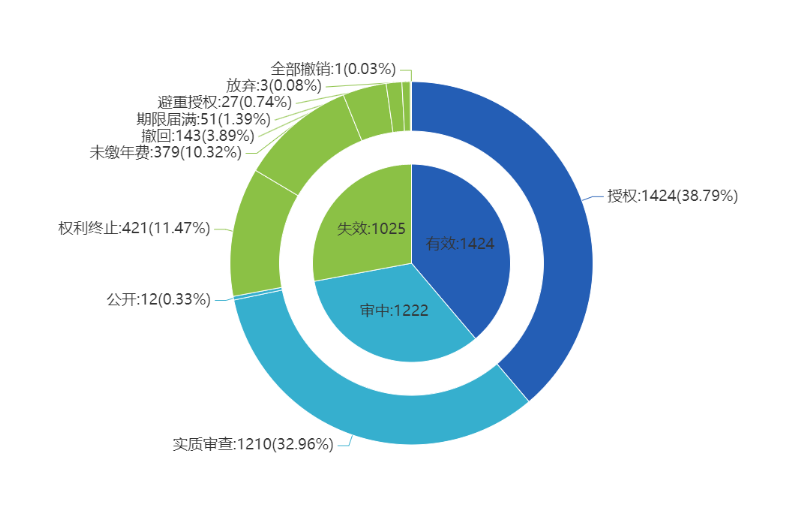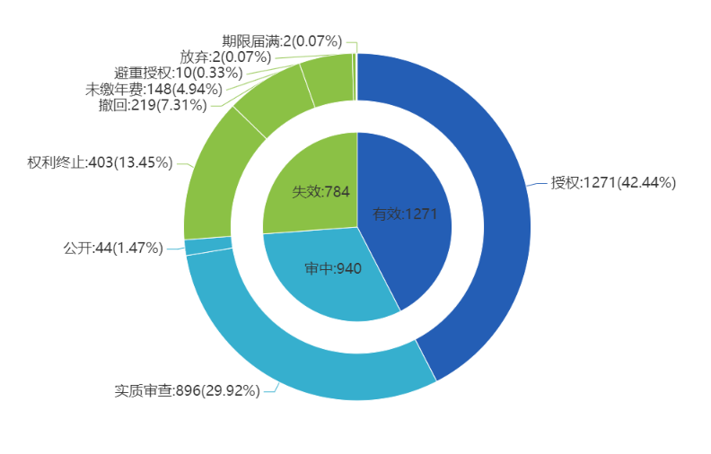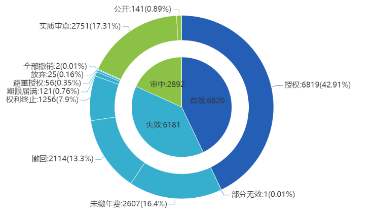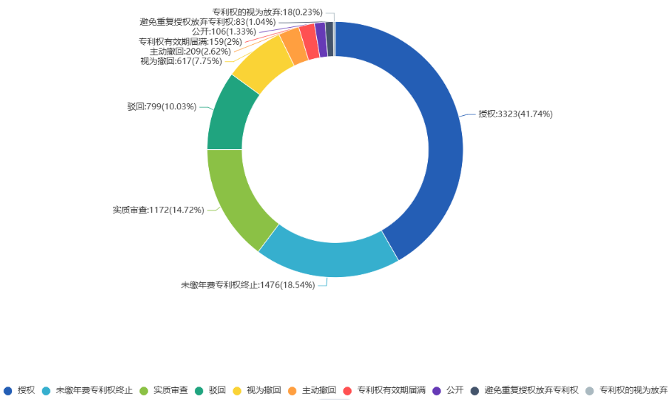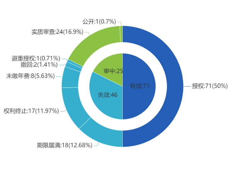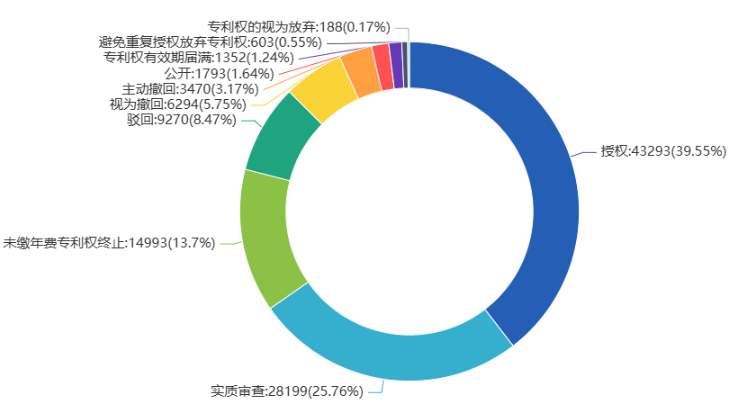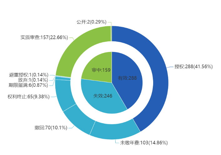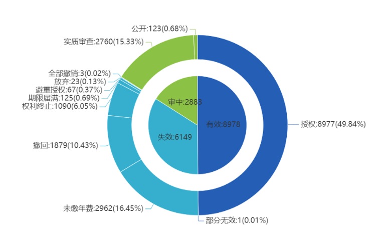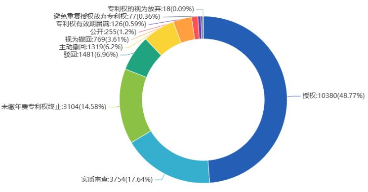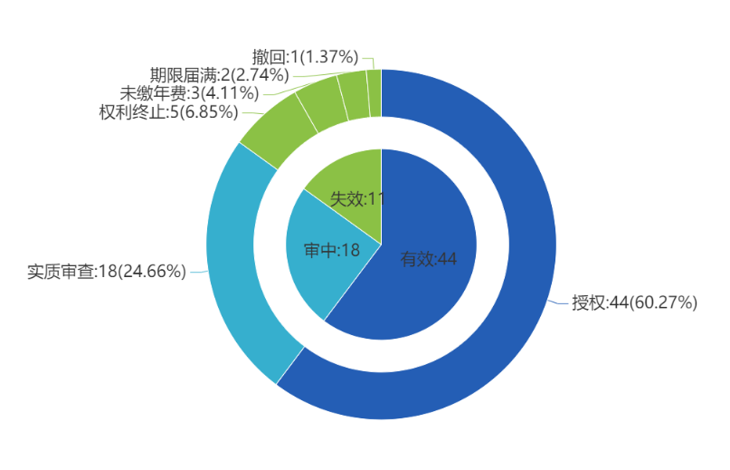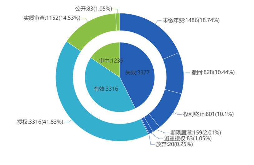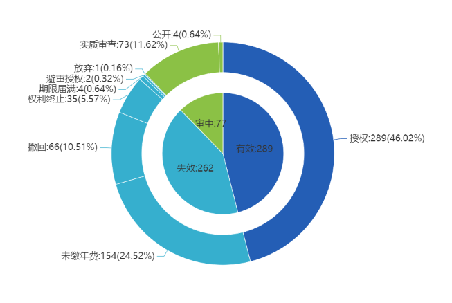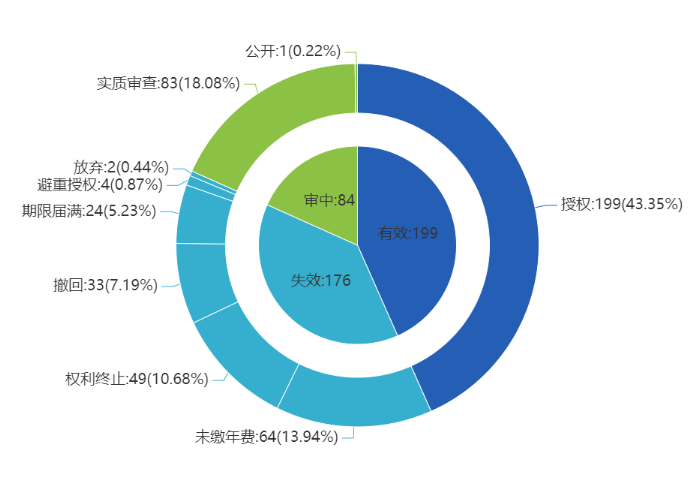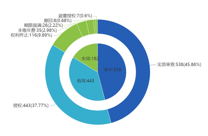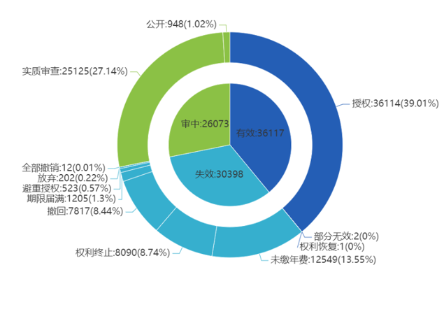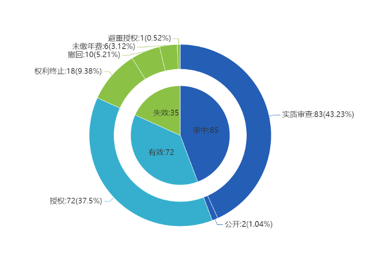 (5)专利法律状态:有效和未决。在本报告中“有效”专利是指到检索截止日为止,专利权处于有效状态的专利申请。在本报告中,专利申请未显示结案状态,称为“未决”。此类专利申请可能还未进入实质审查程序或者处于实质审查程序中,也有可能处于复审等其他法律状态。