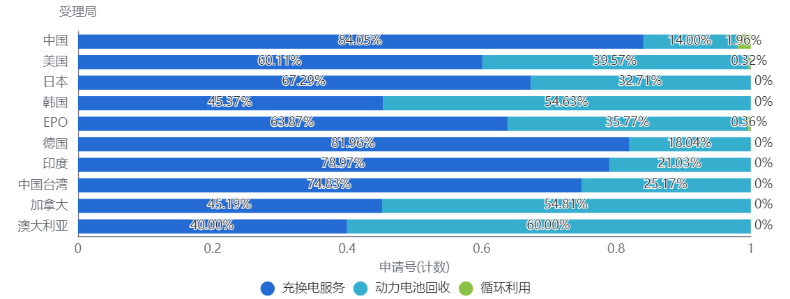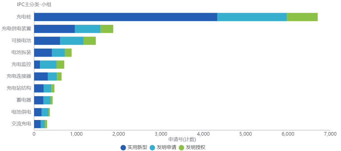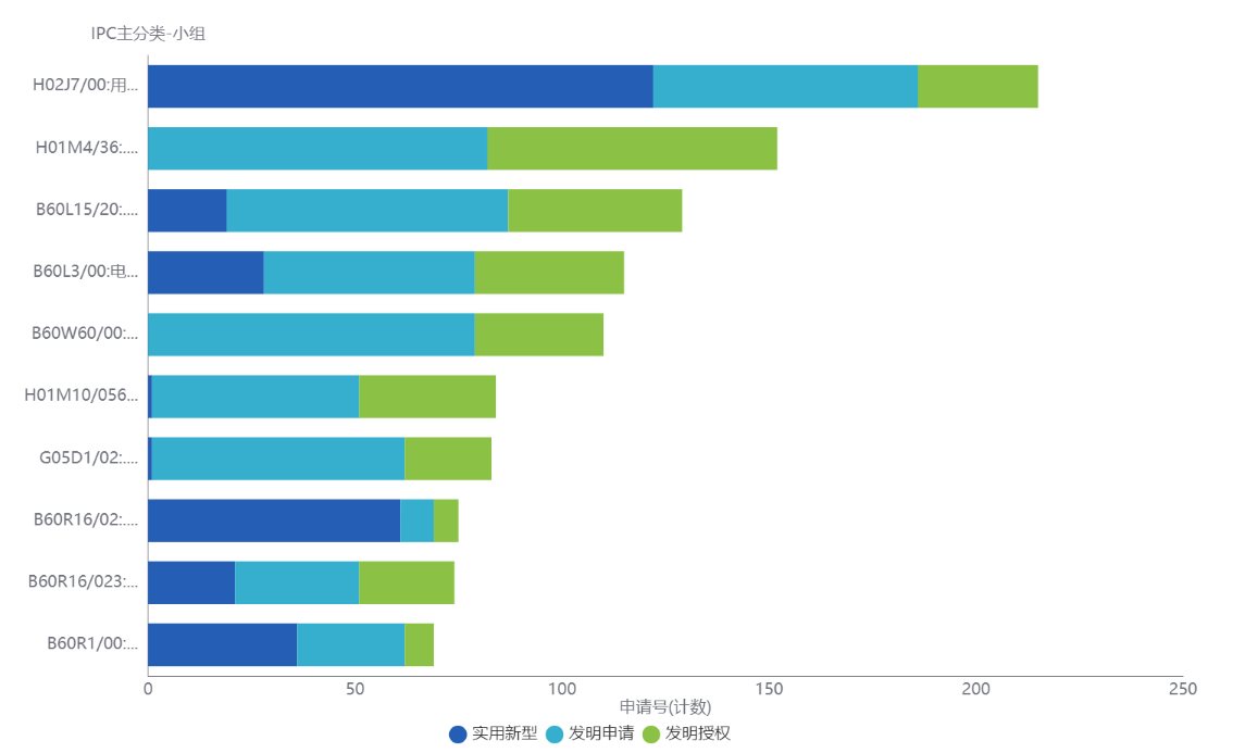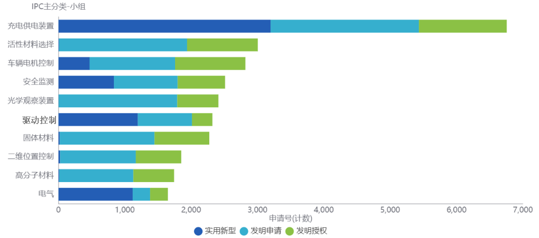 5、从技术构成分布上,上游专利技术主要涉及H02J7/00用于电池组的充电或去极化或用于由电池组向负载供电的装置、H01M10/0562 固体材料的电池、B60W20/00 专门适用于混合动力车辆的控制等技术领域;中游专利技术主要涉及B60L11/18.使用从一次电池,二次电池或燃料电池供应的电力、B60W20/00专门适用于混合动力车辆、H02J7/00用于电池组的充电或去极化或用于由电池组向负载供电的装置;下游专利技术主要涉及B60L53/31特别适用于电动车辆的充电桩、H02J7/00用于电池组的充电或去极化或用于由电池组向负载供电的装置、H01M10/54.废蓄电池有用部件的再生等技术领域。