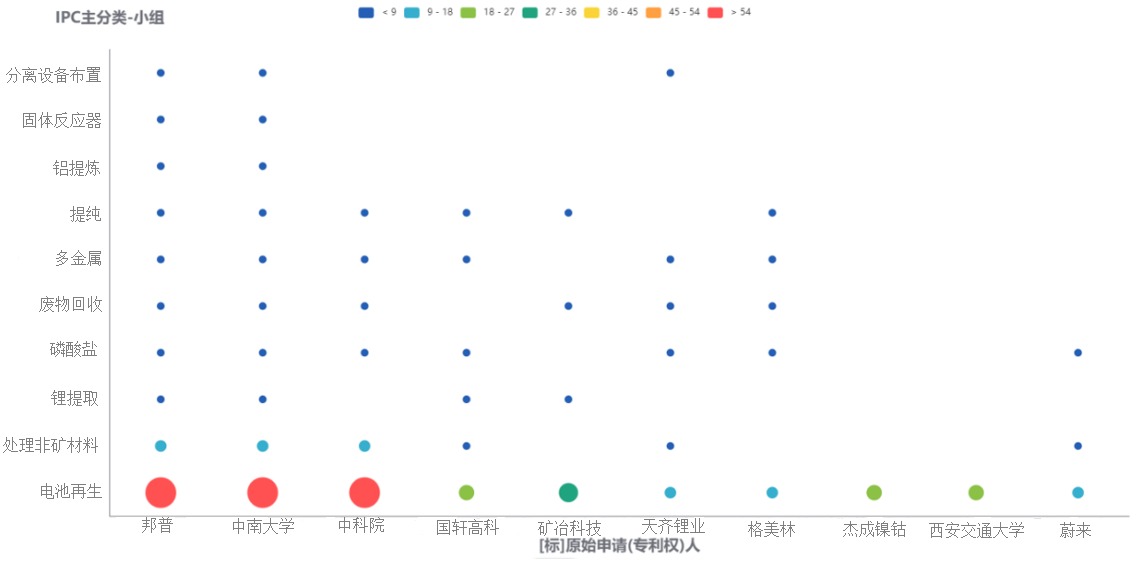 3)武汉蔚能电池资产有限公司以锂离子溶液处理和电芯分离的专利为主,涉及一种综合分离回收退役电池中材料的方法,该方法是:(1)拆解退役电池,获得正极极片与负极极片混合物;(2)将正极极片与负极极片混合物浸泡在水中并搅拌,使正极组分材料和负极组分材料从集流体上剥离;(3)二次过筛,从而分离回收得到粉状负极组分材料、片状正极组分材料、铜和铝。本发明基于正极与负极粘结剂性质不同的原理及金属箔材延展性好的特点,针对正极材料中粘结剂含量较低(小于等于6%)的废弃电池,通过采用水环境下搅拌处理正极极片与负极极片混合物,配合二次过筛处理,能够回收粉状负极组分材料、片状正极组分材料、铜和铝,实现正负极材料与集流体的高效分离及回收。技术方案评价:采用了水浸泡搅拌的方法将退役电池正极材料、负极材料、铝、铜进行分离回收,简化了工艺流程。