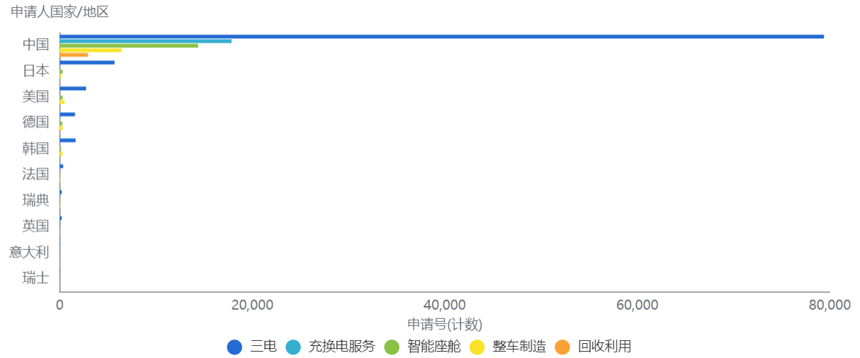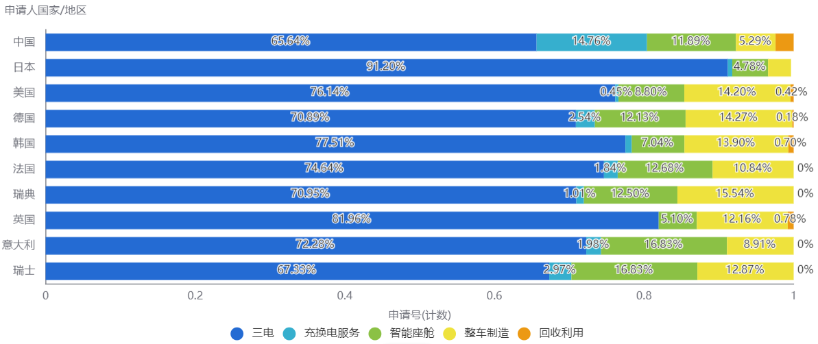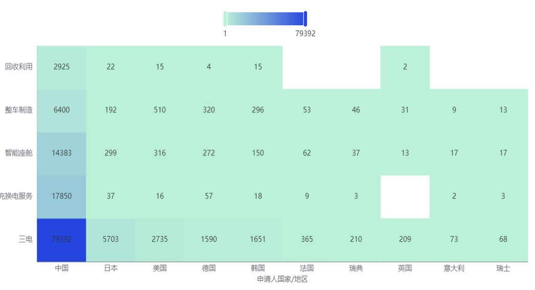 3、在国际区域分布上,新能源汽车供应链上、中、下游技术领域的专利的申请来源国家均主要集中在中国、日本、美国、韩国、德国和法国等国家,在各个环节中国申请量远超其他国家。国内外企业在新能源汽车产业链上游基础零部件技术领域各有所长,呈现出互补和竞争的格局;中游新能源汽车整车制造技术在国内外的发展各有侧重,中国企业在纯电动、插电式混合动力和燃料电池汽车等多元技术路线上积极布局,推动行业加速变革;国外企业在新能源汽车整车制造技术上具有较早的研发历史和技术积累,他们在车辆设计、系统集成、智能化和自动驾驶技术上取得一定成就;中国在新能源汽车下游充换电服务和回收利用技术领域具有显著的专利优势和市场影响力。