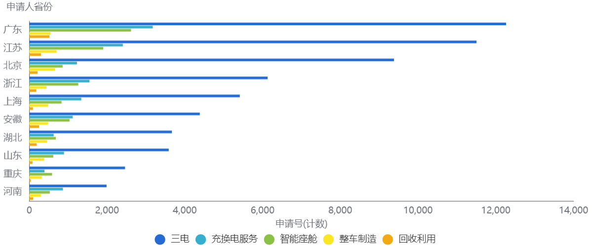 4、在国内区域分布上,上游技术中三电技术专利主要集中在广东、江苏、北京、浙江、上海等,湖北省排名相对靠后,且不足广东省申请量的1/3;智能座舱技术专利主要集中在广东、江苏、浙江、安徽、北京、上海等,湖北省申请量居全国第七。中游技术中整车制造技术专利主要集中在江苏、北京、广东、上海、安徽、湖北、浙江、山东、重庆、河南等,湖北省排名居第二梯队。下游技术中充换电服务技术专利主要集中在广东、江苏、浙江、上海、北京、安徽等,湖北省排名相对靠后,回收利用技术专利主要集中在广东、江苏、湖南、安徽、北京、湖北、浙江等,湖北省申请量居中。