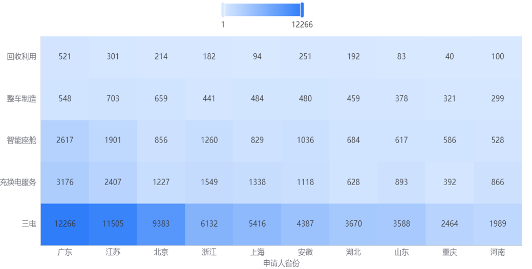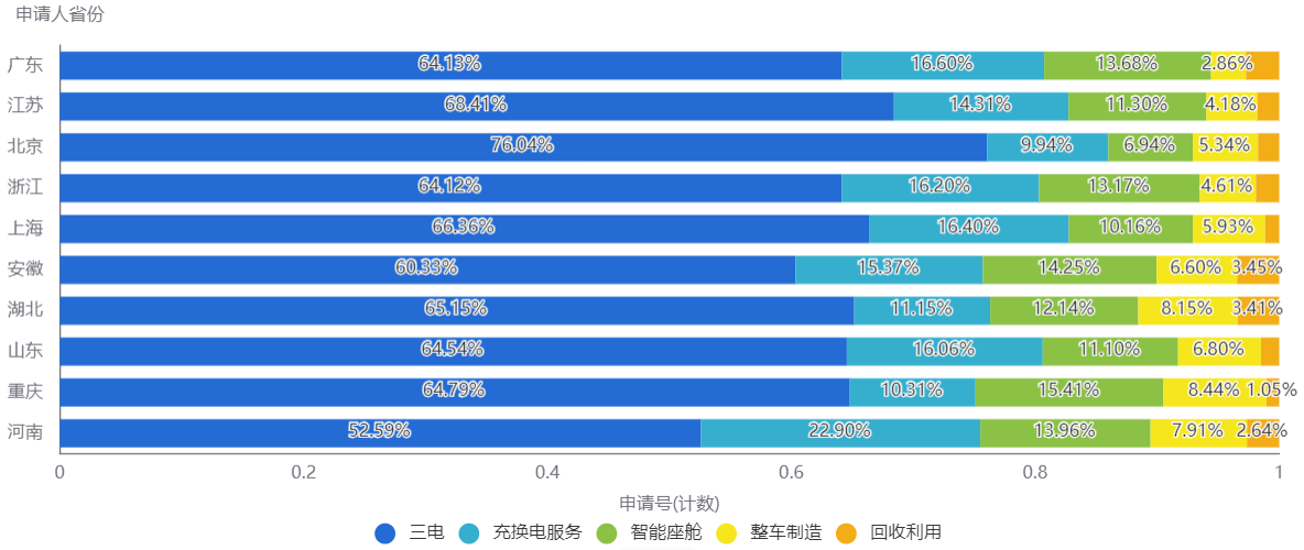 7、从上中下游各自的主要技术分支看,三电技术和智能座舱技术的申请主要来源于沿海地区和中部地区,国内各主要申请人均在三电技术和智能座舱技术领域具有广泛的专利布局,国内申请量较多的企业均为长安汽车、中国一汽、浙江吉利、比亚迪等;整车制造技术的申请来源省及直辖市主要集中在江苏和北京,国内在整车制造技术领域申请量较多的企业为中国一汽、长安汽车、奇瑞和北京新能源等;下游相关技术中,充换电服务和回收利用技术领域的申请均主要来源于广东和江苏,且沿海地区的申请量远超其他地区的申请量,占据绝对的优势,相关申请人中国内企业占据主要地位。湖北地区的新能源汽车产业链中游技术相较于上游和下游技术发展更好,并取得了一定的进展,但与国内经济发达和技术创新活跃的地区仍存在差距。