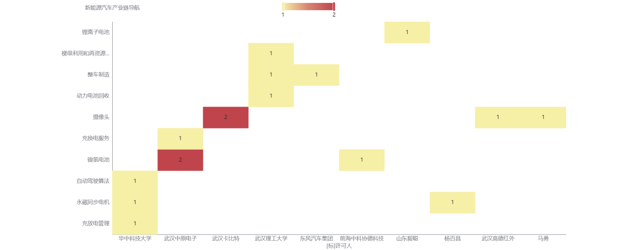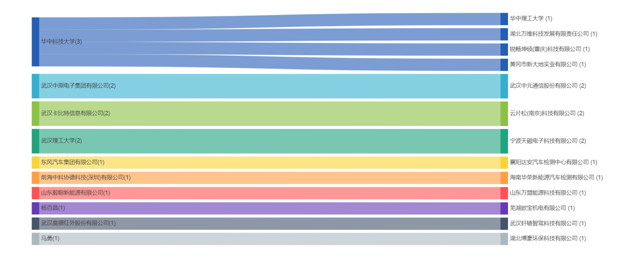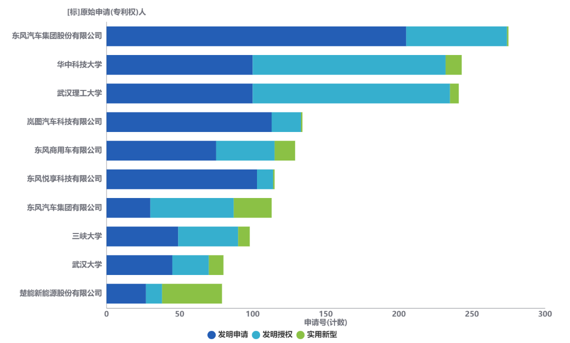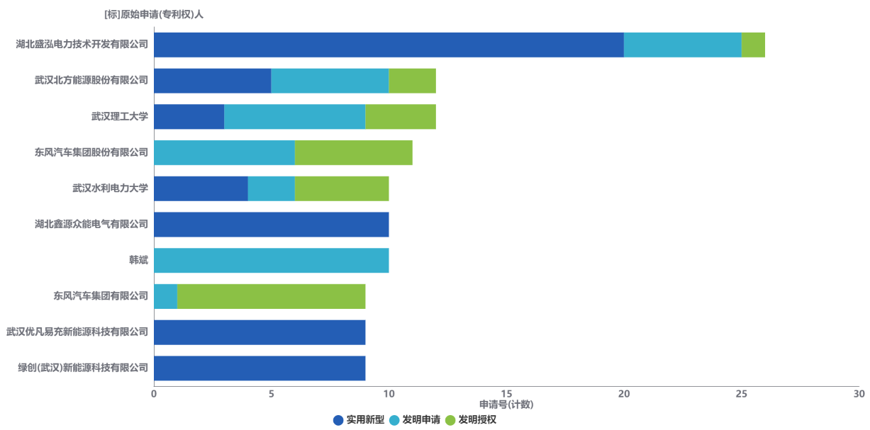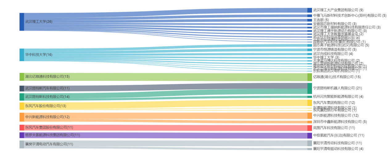 4、在新能源汽车产业链上游相关技术中,湖北省内在该技术领域申请量较多的企业包括东风汽车集团、楚能新能源股份有限公司、格罗夫氢能源科技集团有限公司、湖北盛泓电力技术开发有限公司、亿咖通(湖北)技术有限公司等,高校包括华中科技大学、武汉理工大学、三峡大学等,与企业研究方向形成互补;在新能源汽车产业链中游相关技术中,省内在该技术领域申请量较多的申请人为东风汽车集团、格罗夫氢能源科技集团有限公司、武汉理工大学等,与全国研究热点一致;新能源汽车产业链下游相关技术中,省内在该技术领域申请量较多的申请人为湖北盛泓电力技术开发有限公司、武汉蔚能电池资产有限公司、格林美股份有限公司、东风汽车集团等,主要研发方向集中在充电桩和废旧电池回收利用等。