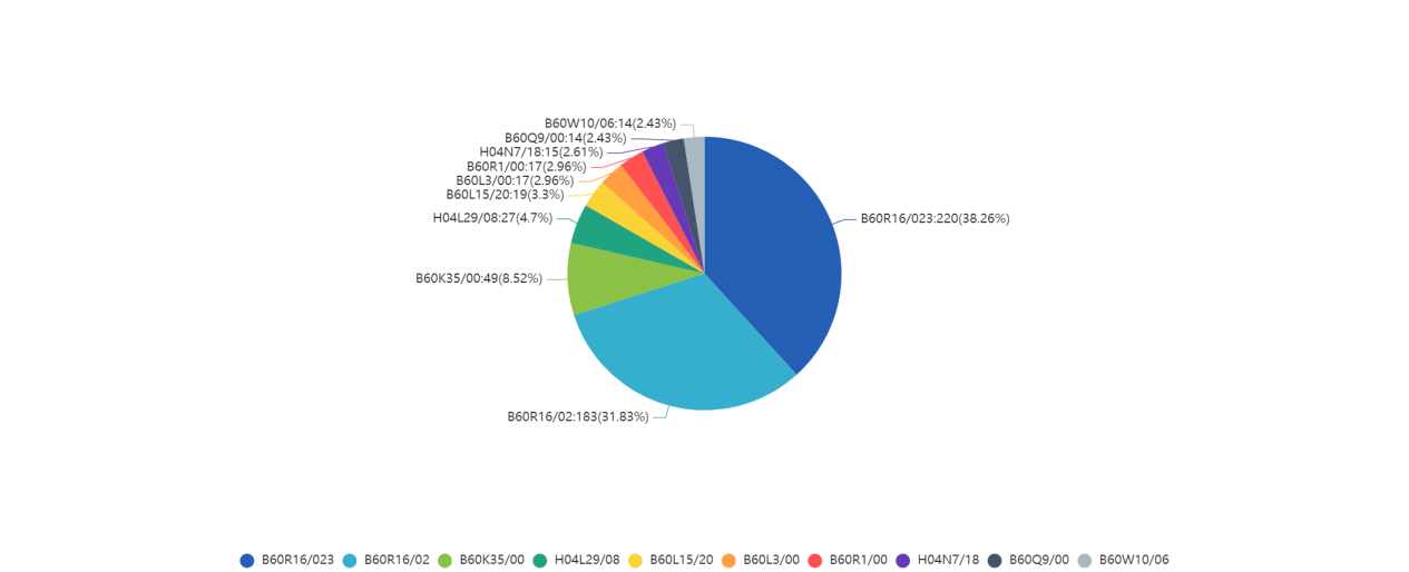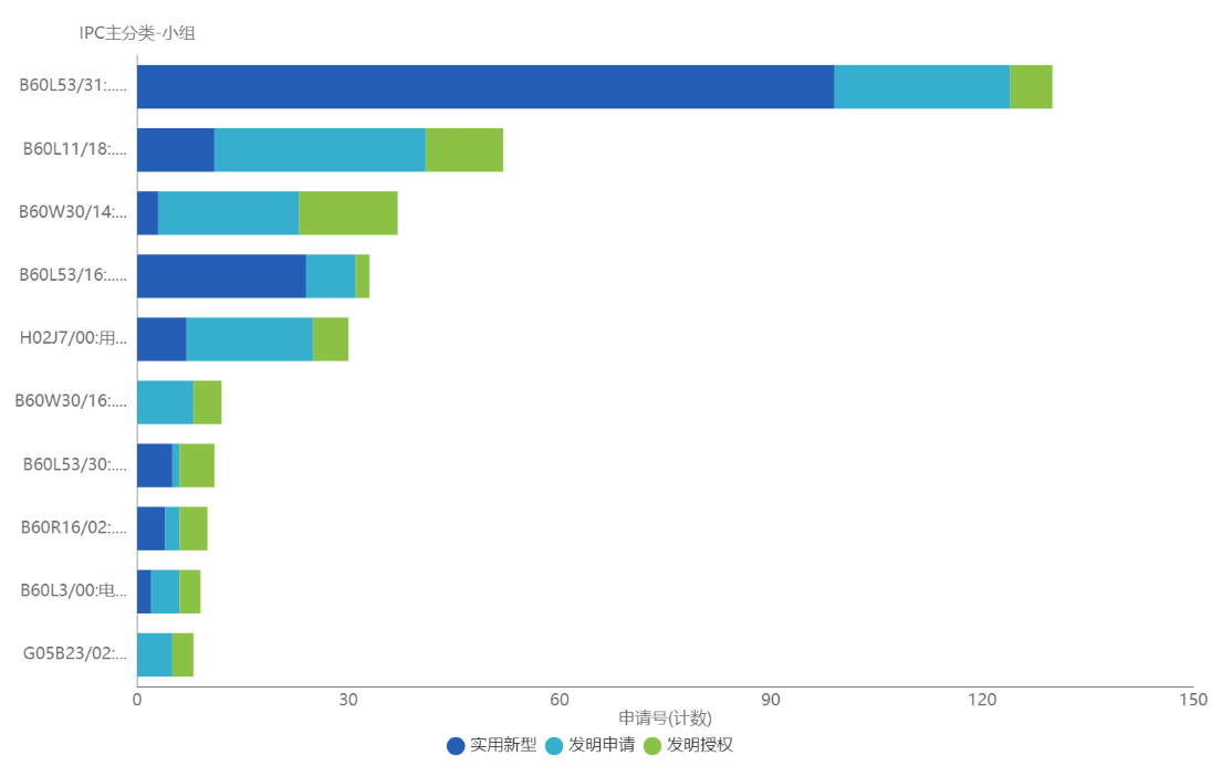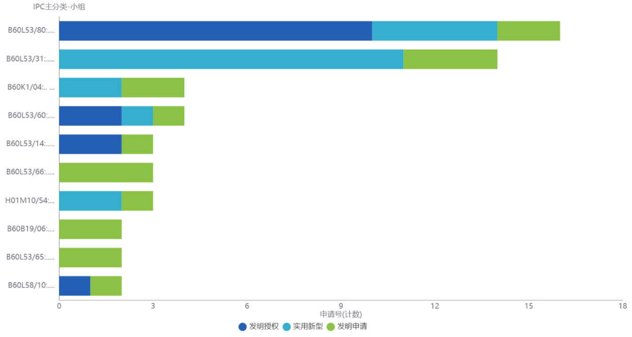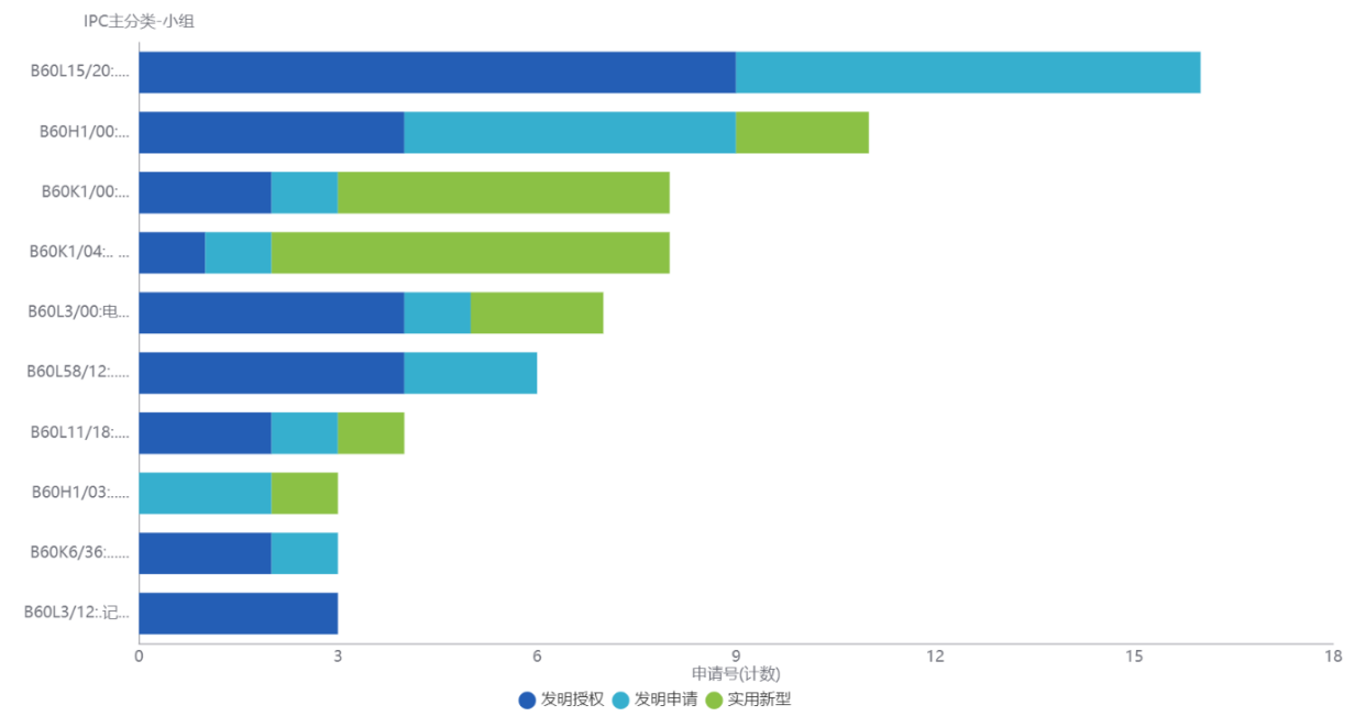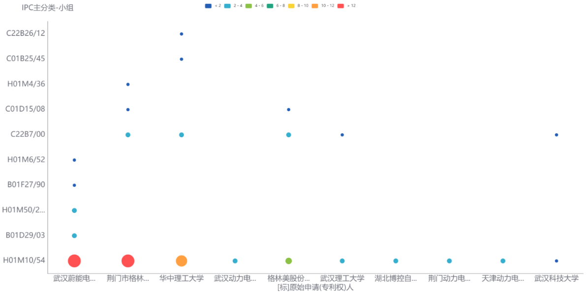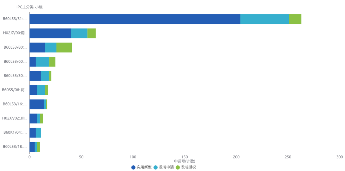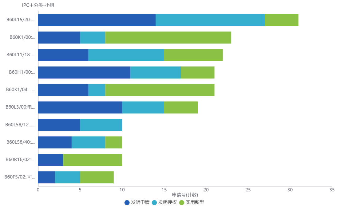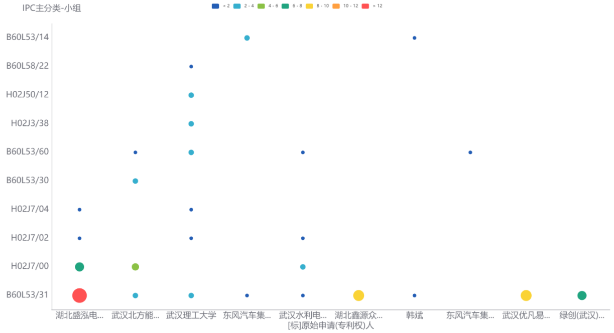 5、从技术方向上看,在上游相关技术中,湖北省内高校主要关注材料改进,与企业研究方向互补;在中游相关技术中,省内各申请人均较为关注B60L15/20 .用于控制车辆或其驱动电动机,以达到期望的特性,例如速度、转矩或程序化速度变量、B60H1/00加热、冷却或通风设备、B60L3/00电动车辆上安全用电装置;运转变量,例如速度、减速、能量消耗的监测方向,与全国研究热点一致;在下游相关技术中,省内各申请人主要研发思路在B60L53/31 ..特别适用于电动车辆的充电桩和H01M10/54 .废蓄电池有用部件的再生方向。