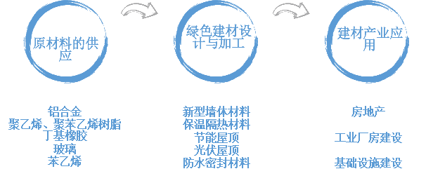 由于绿色建材产业所包含的绿色建材数量达到万级,所以本研究的对象限定为湖北省绿色建材产业。绿色建材又称生态建材、环保建材和健康建材,指健康型、环保型、安全型的建筑材料,在国际上也称为“健康建材”或“环保建材”,绿色建材不是指单独的建材产品,而是对建材“健康、环保、安全”品性的评价。绿色建材上游包括铝合金、聚乙烯、聚苯乙烯树脂、丁基橡胶、玻璃、苯乙烯等原材料;中游包括新型墙体材料、保温隔热材料、节能门窗、光伏屋顶、防水密封材料、空气净化材料、抗菌材料等;下游应用于房地产、工业厂房建设、基础设施建设。如图1-1所示。绿色建材产业具有产业链长、涉及面广、带动性强等特点,是一个典型的综合型产业。