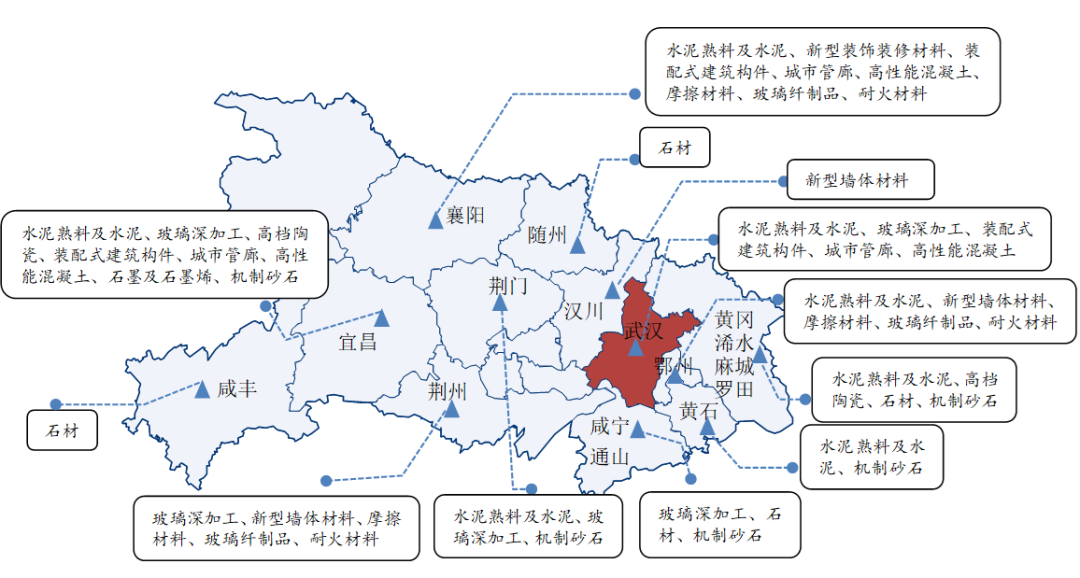 产业布局在一定程度上反映了该区域对绿色建材产业的重视程度,如图1-4所示湖北省绿色建材产业布局。