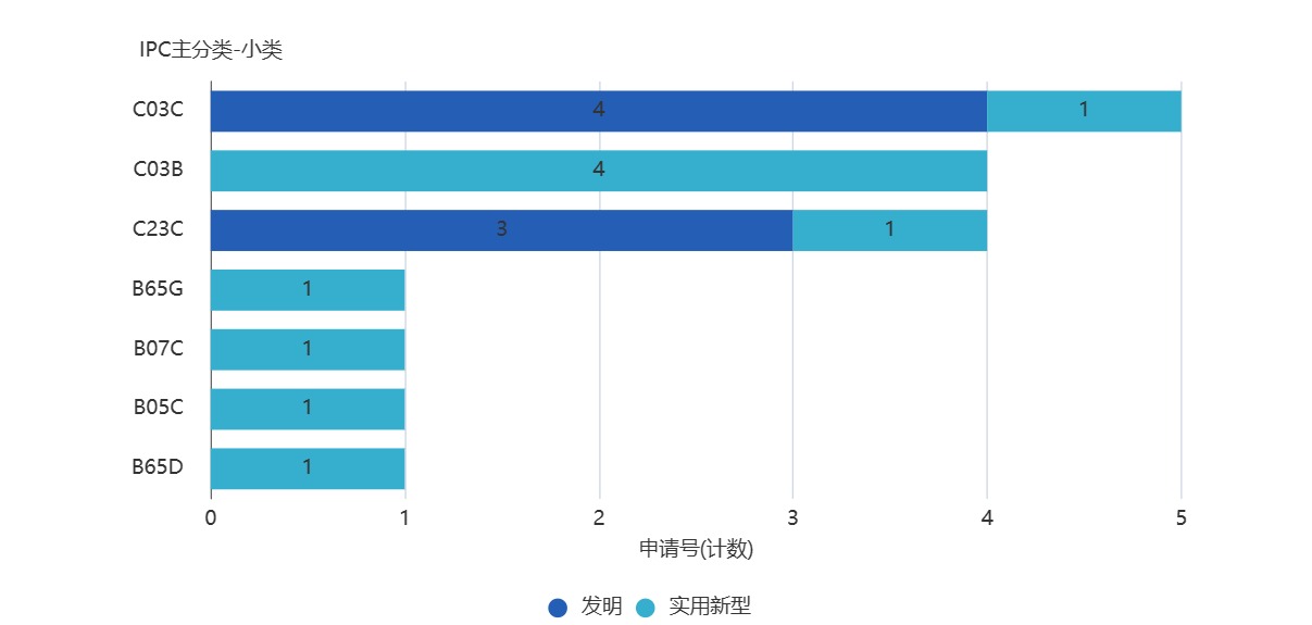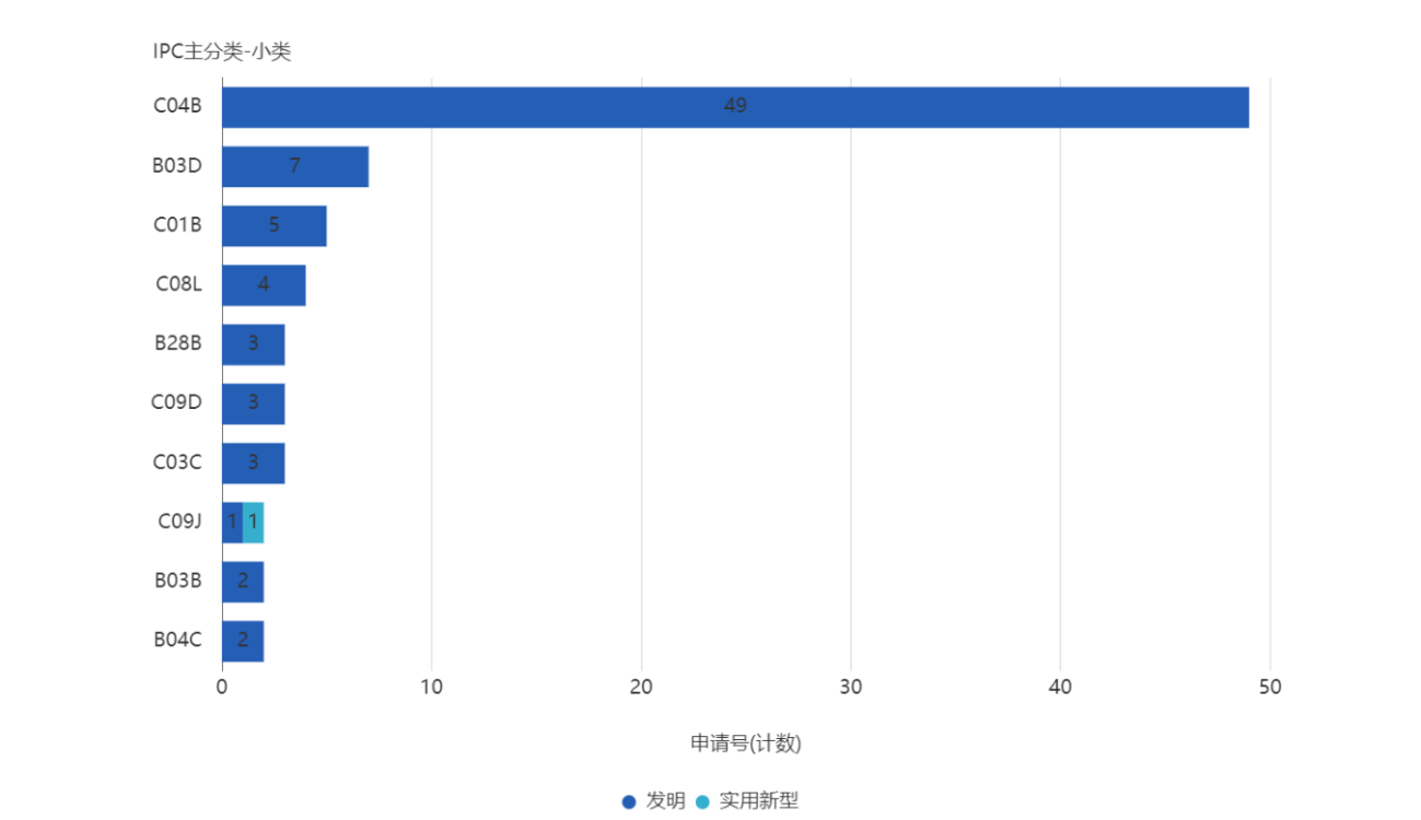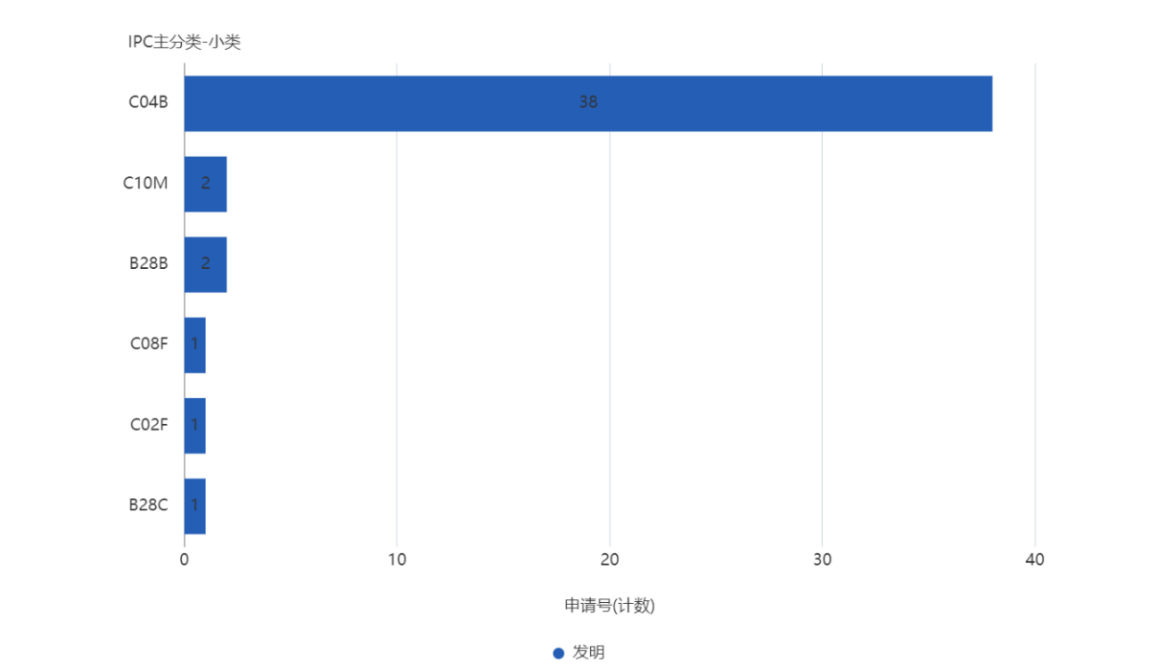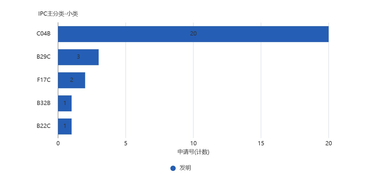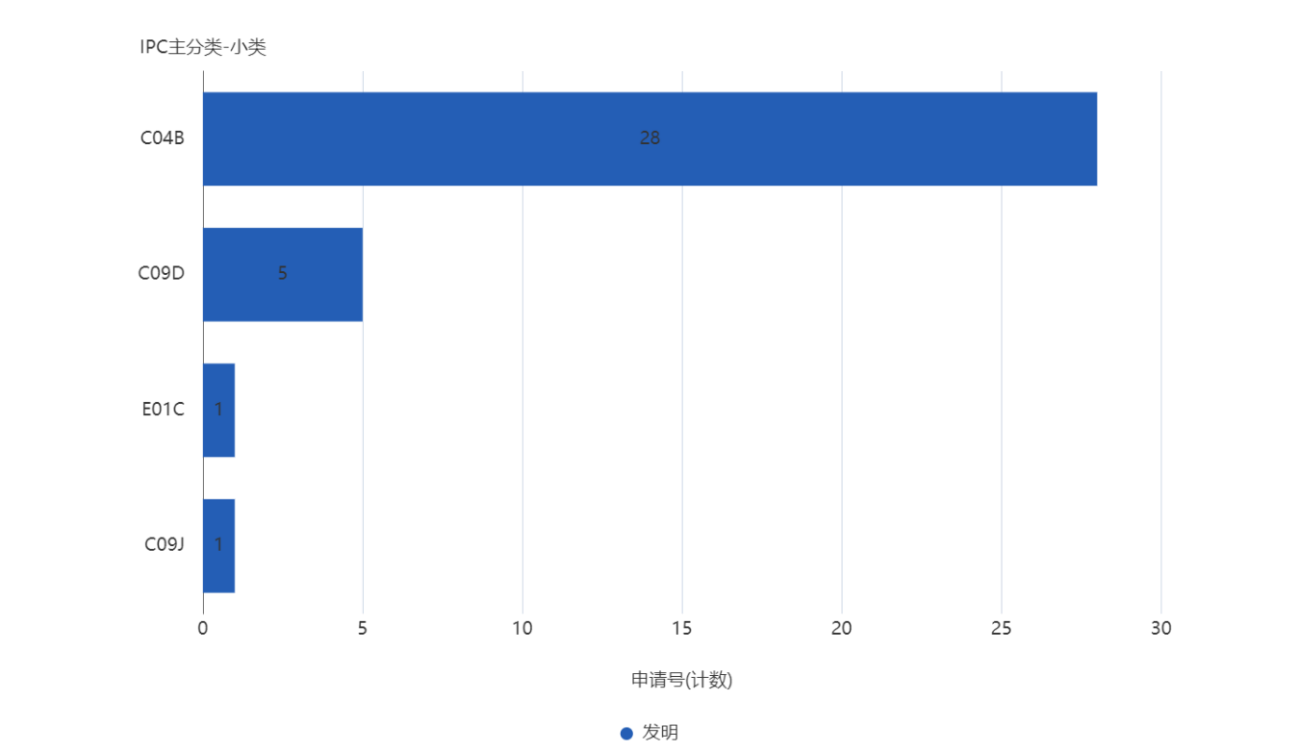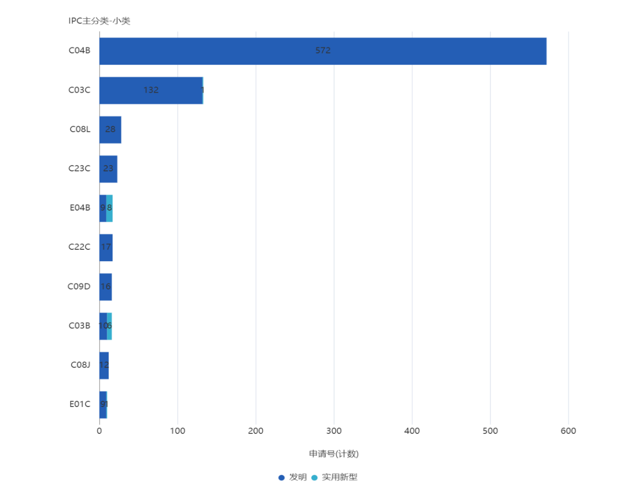 补充检索阶段:在前期全面检索的基础上,统计本领域主要申请人,并利用IPC分类号统计工具确定与材料相关的分类号范围,从主要申请人及分类号两个维度对前期获取的检索成果进行补充。