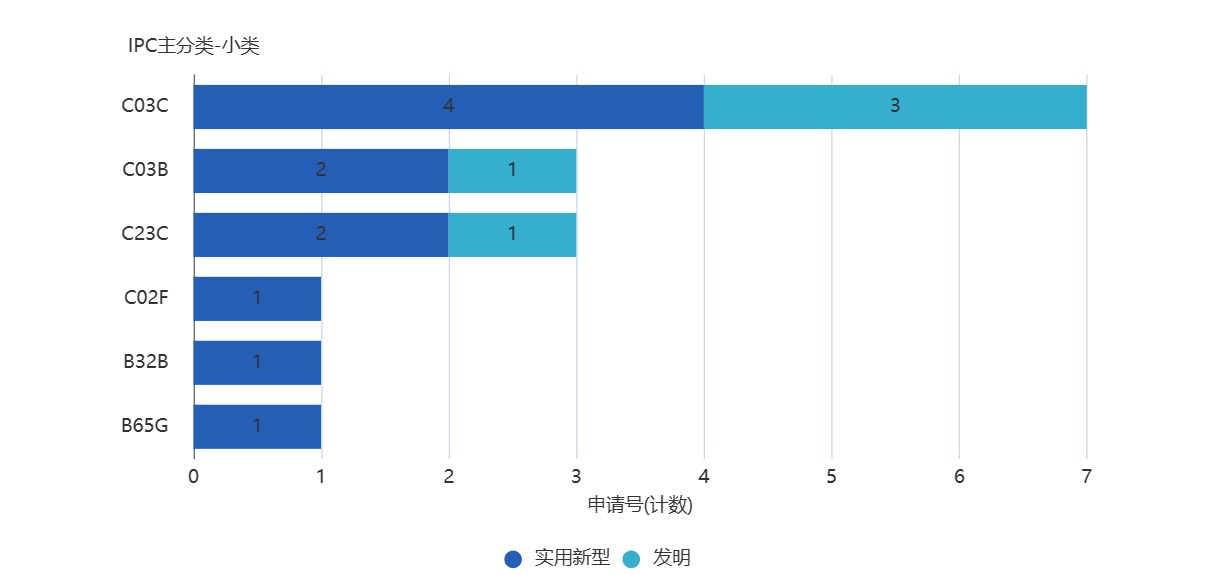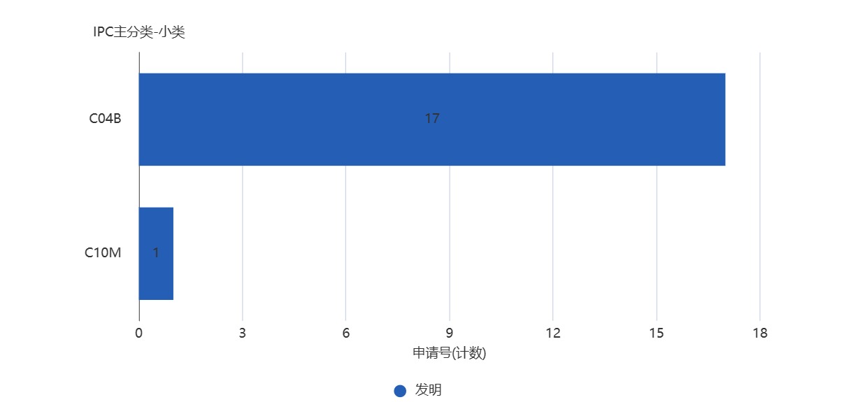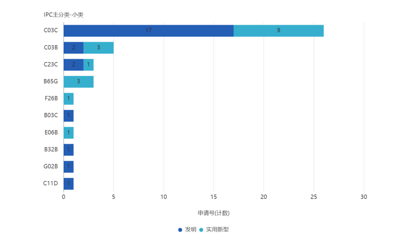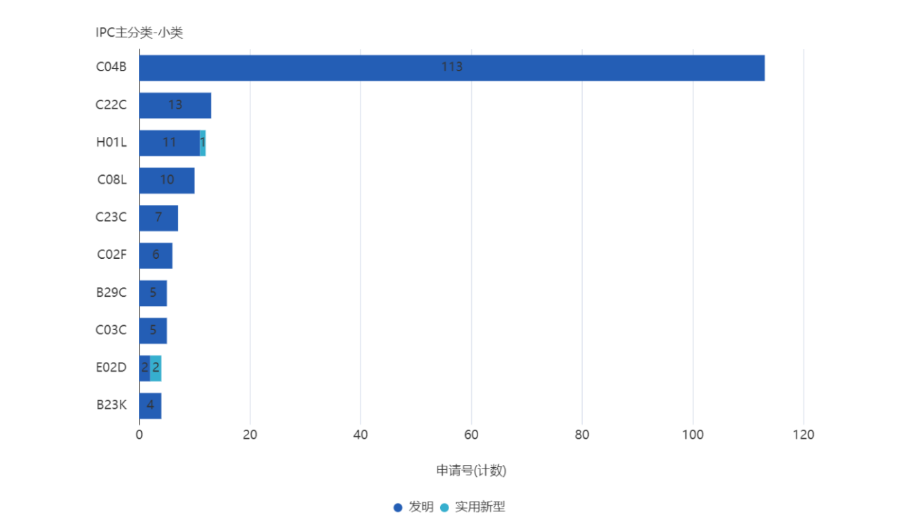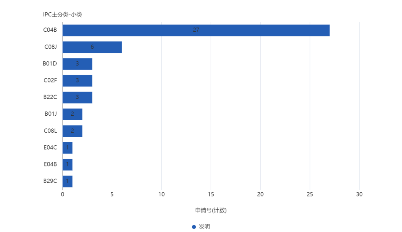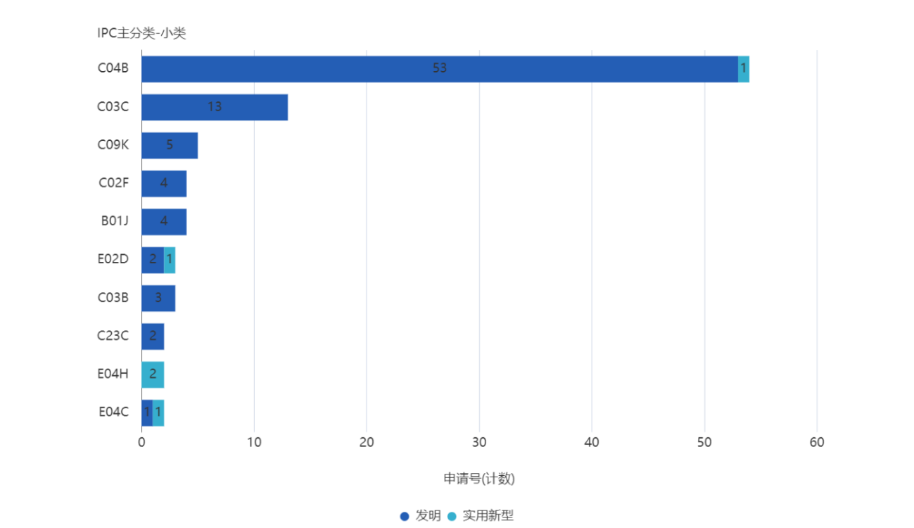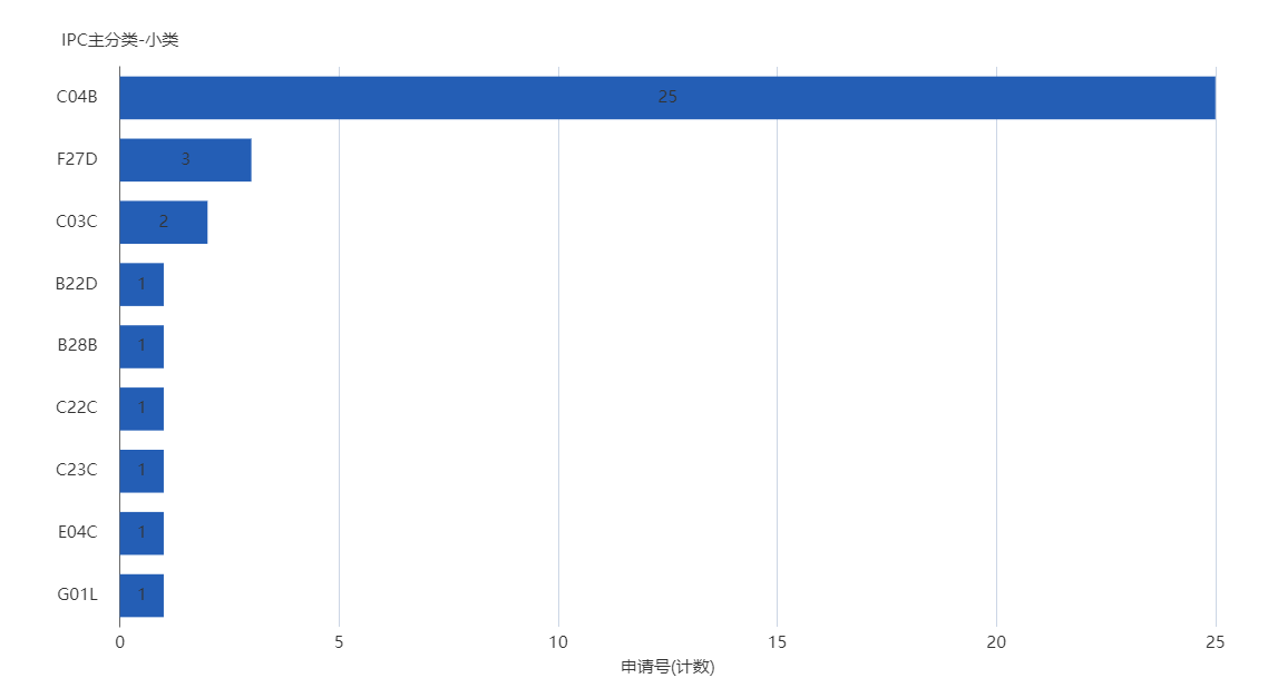 补充检索阶段:在前期全面检索的基础上,统计本领域主要申请人,并利用IPC分类号统计工具确定与材料相关的分类号范围,从主要申请人及分类号两个维度对前期获取的检索成果进行补充。