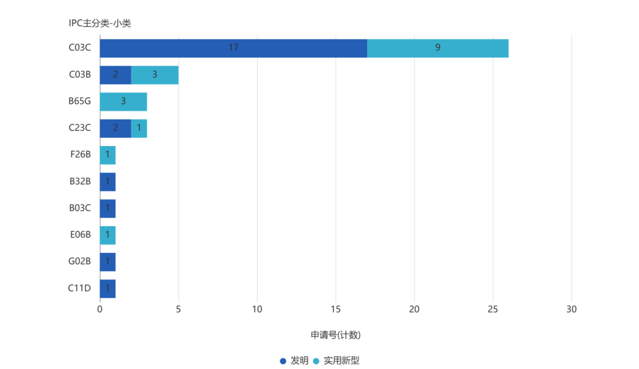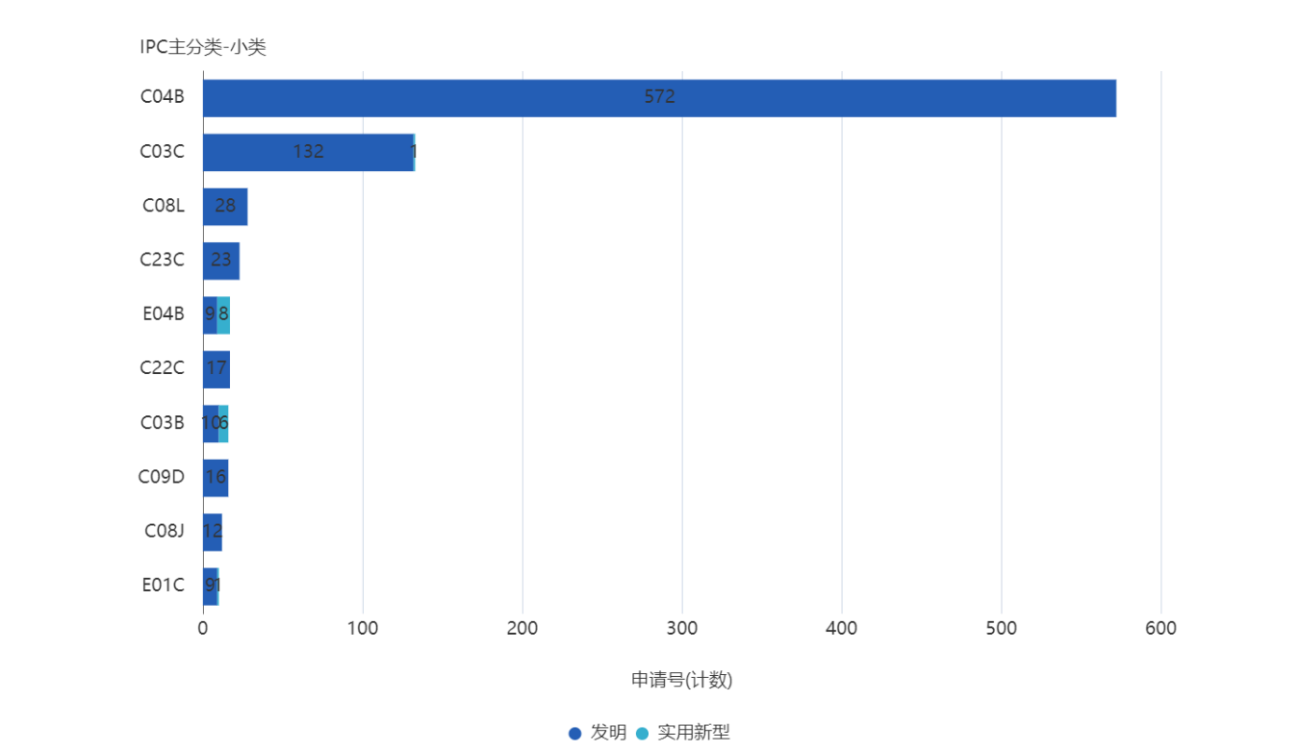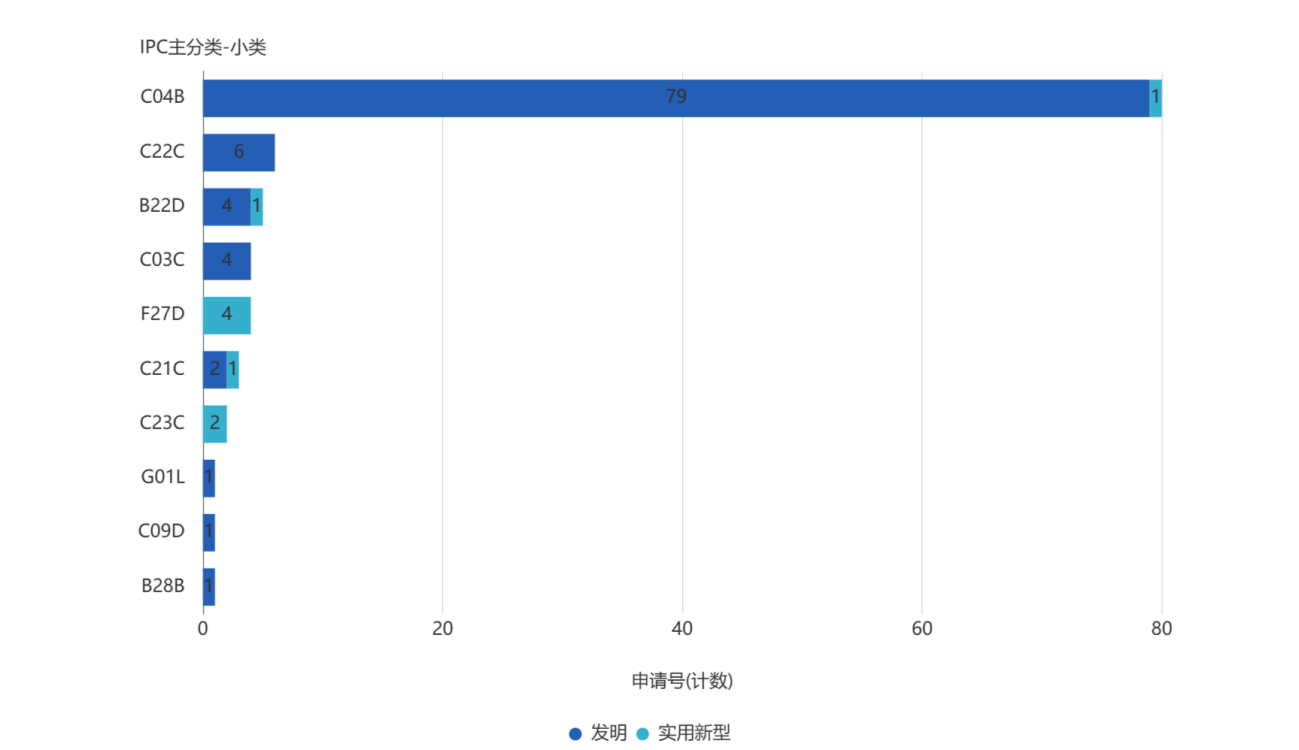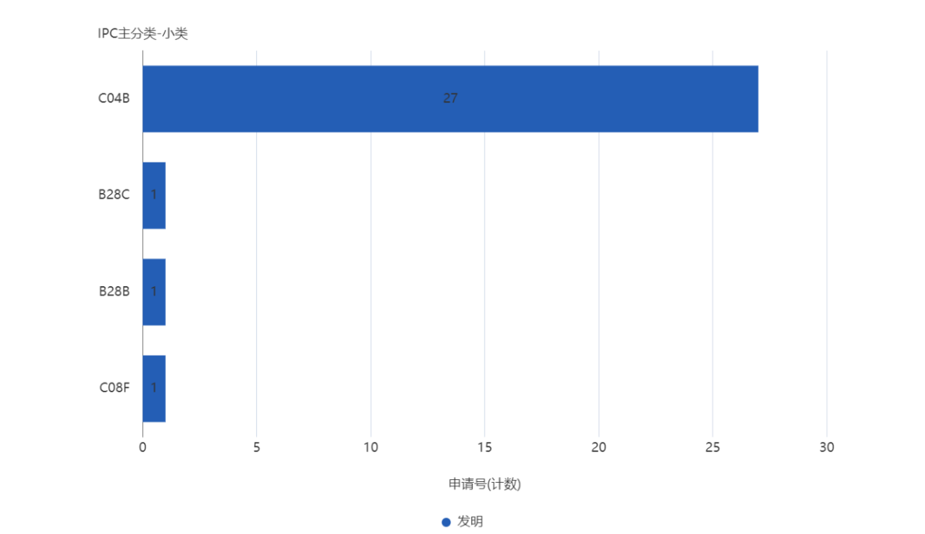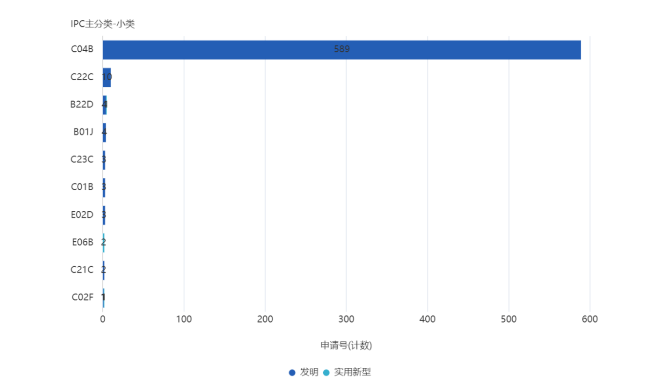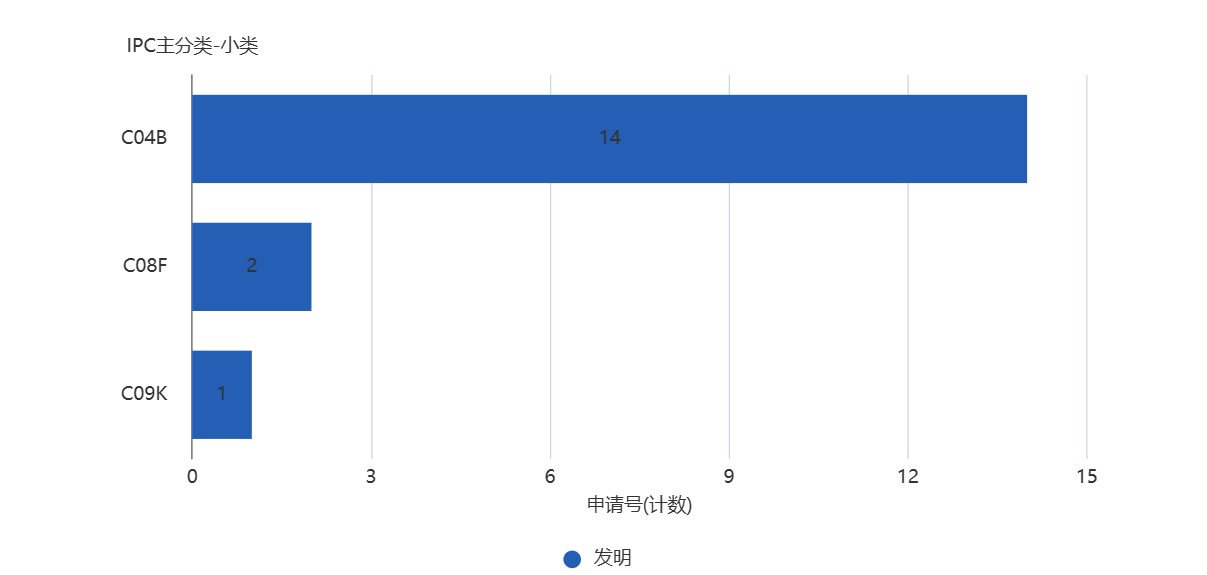 补充检索阶段:在前期全面检索的基础上,统计本领域主要申请人,并利用IPC分类号统计工具确定与材料相关的分类号范围,从主要申请人及分类号两个维度对前期获取的检索成果进行补充。