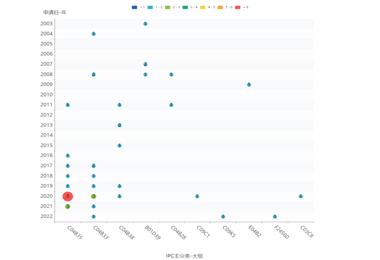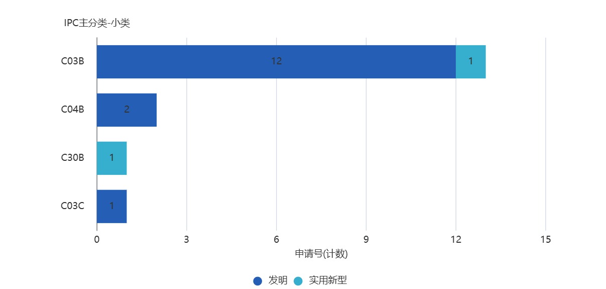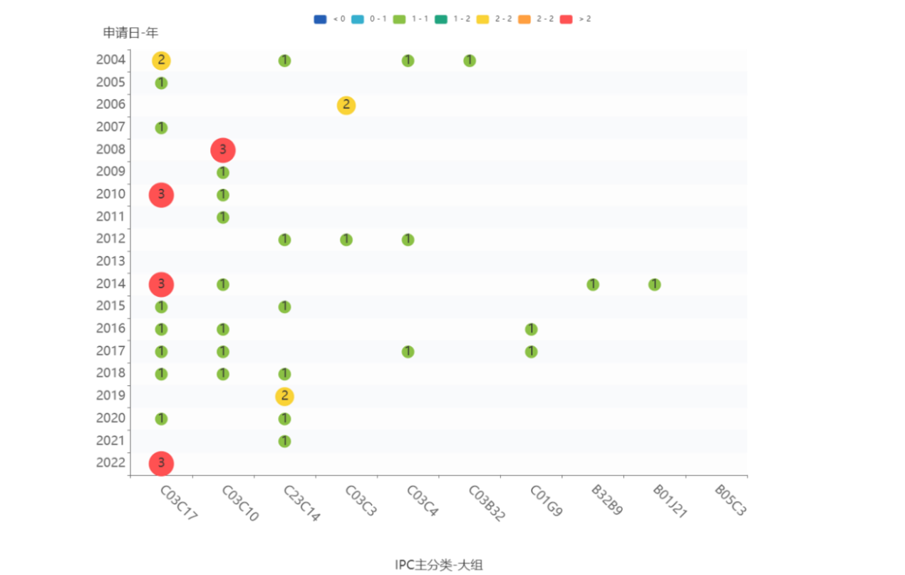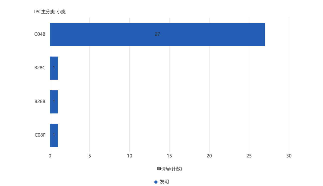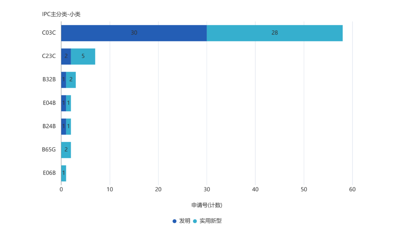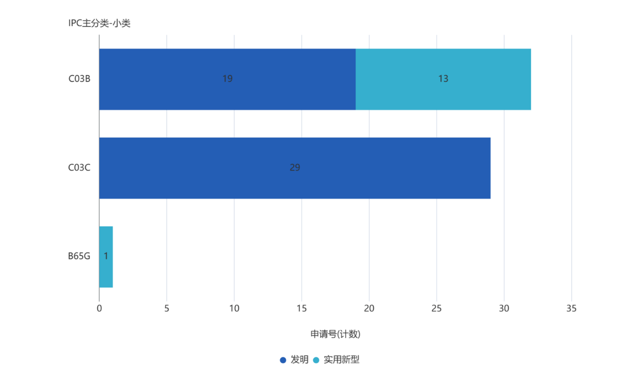 补充检索阶段:在前期全面检索的基础上,统计本领域主要申请人,并利用IPC分类号统计工具确定与材料相关的分类号范围,从主要申请人及分类号两个维度对前期获取的检索成果进行补充。