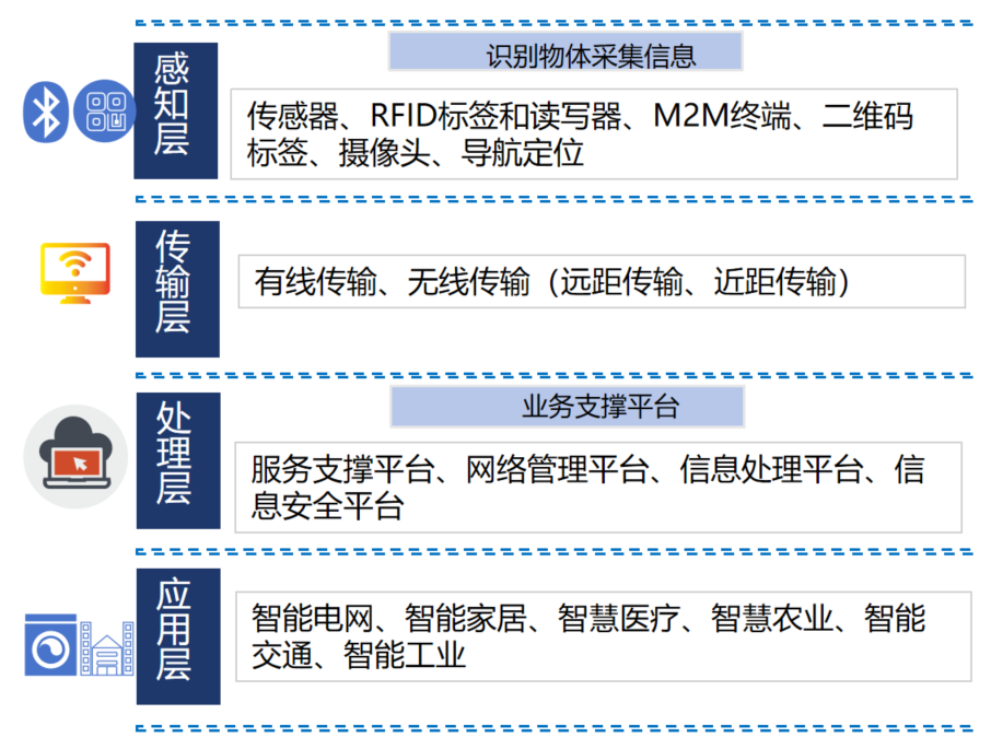1)通过各种传感器、RFID标签、二维码、摄像头等设备和技术,实现对物体的识别和信息的采集的感知层;