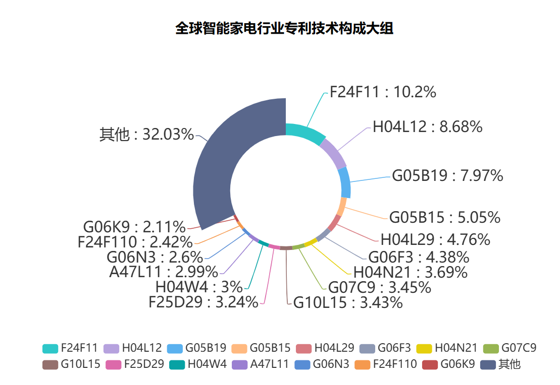 对检索到的专利数据按照IPC分类号大组分类汇总,全球智能家电技术构成前15名中占比前三的技术分支分别为F24F11(控制或安全布置)、H04L12(数据交换网络)和G05B19(程序控制系统),占比分别为10.2%、8.68%和7.97%,表明在智能家电产业中,控制和安全布置技术、数据交换网络和程序控制系统是关键核心技术,这也与物联网的三层架构即感知层、网络传输层和应用层相呼应。