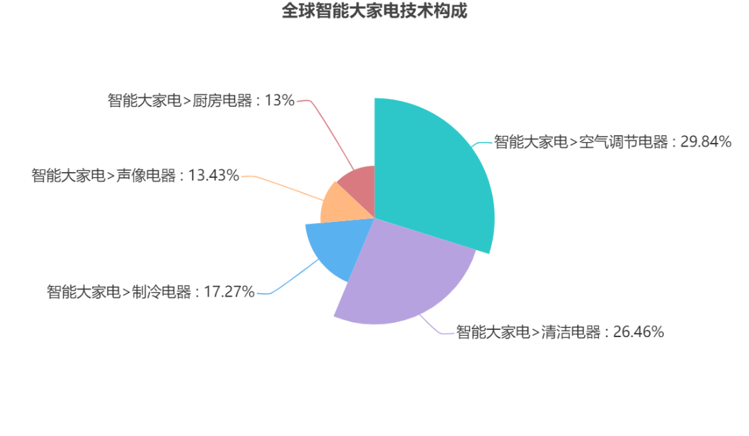对前述检索的专利数据按照技术分解进行人工标引后,在智能大家电中,与智能空气调节相关的专利技术占比最多,达29.84%,表明空调、空气净化器、空气加湿器等家用电器的智能化是目前最主要的研发热点。其次是能够减轻家务负担,适应现代人快节奏生活的智能清洁电器,占比为26.46%,包括扫地机器人、扫拖机器人、智能洗地机、智能擦窗机等。排名3-5的分别为智能制冷电器、智能声像电器和厨房电器,分别占比17.27%、13.43%、13%,主要包括智能冰箱、智能冷柜、智能酒柜、智能电视、智能音箱、智能蒸烤箱、智能洗碗机等。总体来看,传统家电智能化依然是当前主流研发热点,但是新兴智能电器,如智能清洁电器,该类电器虽然起步晚,但发展迅速、市场广阔、研究热度比较高。