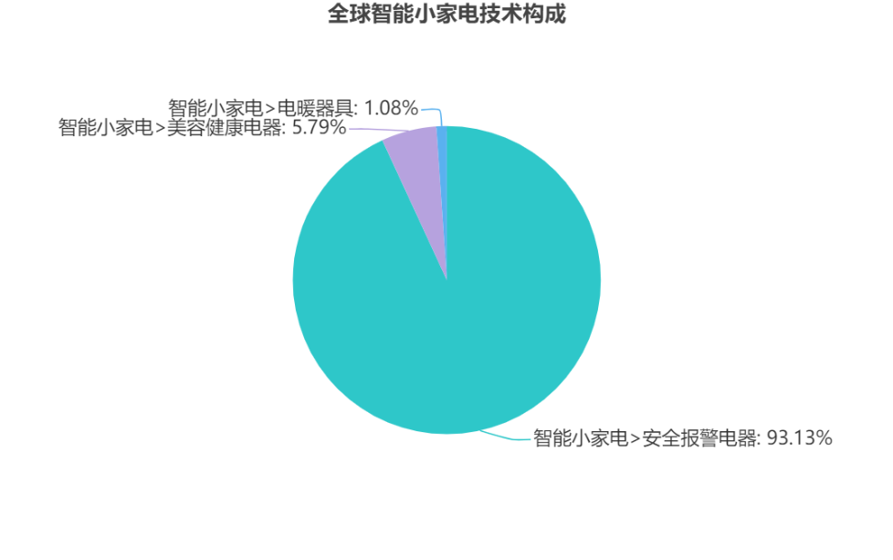 在智能小家电专利技术中,智能安全报警电器专利技术占比最多,为93.13%,该类电器包含智能门锁、智能烟雾报警器、智能声光报警器、智能防盗报警器等,表明当前用户对家居安全性有较高需求。其次是美容健康电器,为5.79%,该类电器包括美容仪、电吹风、健身设备等。占比最低的是电暖器具,仅1.08%,这与空气调节技术发展迅速,空调、暖气等普及率高,小型电暖器具的市场需求不足有关。