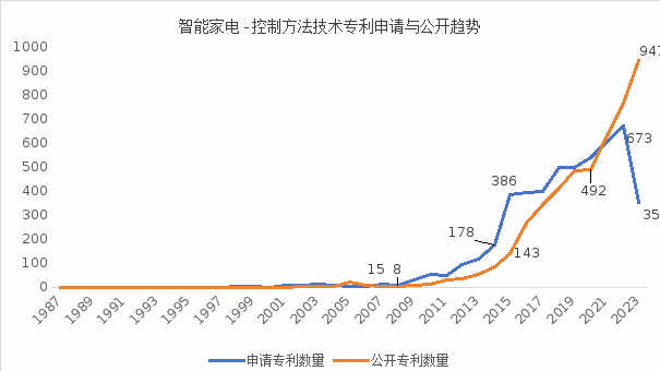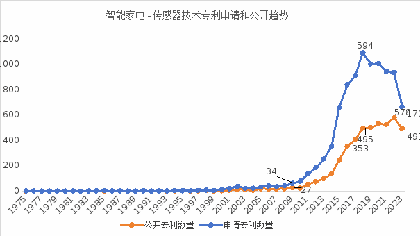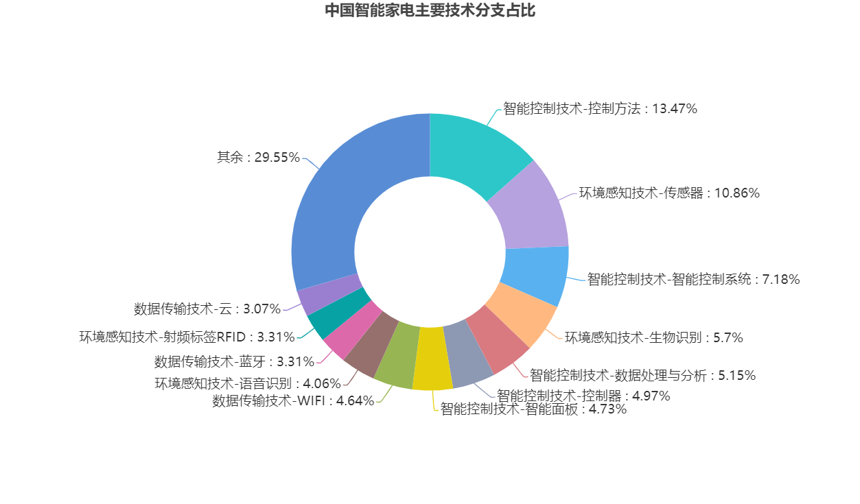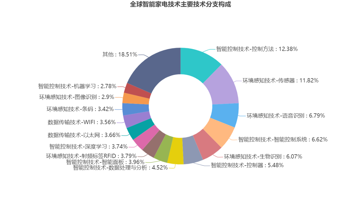 基于前述技术分解和人工标引数据,针对家电智能化控制技术的三个主要技术分支环境感知技术、数据传输技术和智能控制技术,其中,控制方法(即控制算法类)和传感器技术分支上积累的专利量排在前2位,占比分别为12.38%和11.82%,表明目前全球的研究热点聚焦在控制方法和传感器这两个技术分支上。
