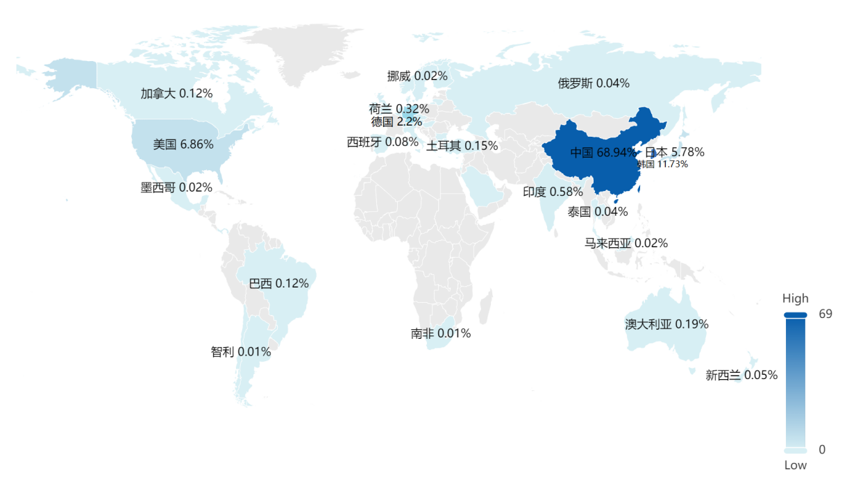 中国是全球智能家电技术第一大技术来源国,专利申请量占全球智能家电专利总申请量的68.94%,显示出中国在智能家电产业中的强大研发实力和创新能力。韩国是全球智能家电技术的第二大来源国,专利申请量占全球智能家电专利总申请量的11.73%。美国和日本分别排名第三和第四,专利申请量占比分别为6.86%和5.78%。除了以上四个主要国家外,其他国家在智能家电领域的专利申请量相对较少。