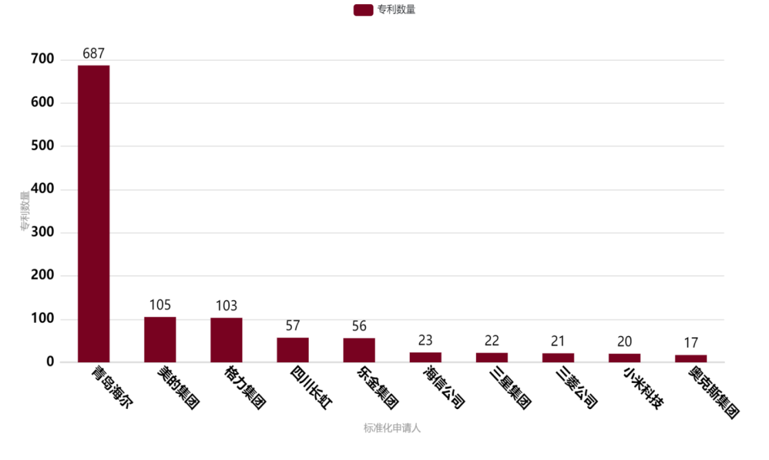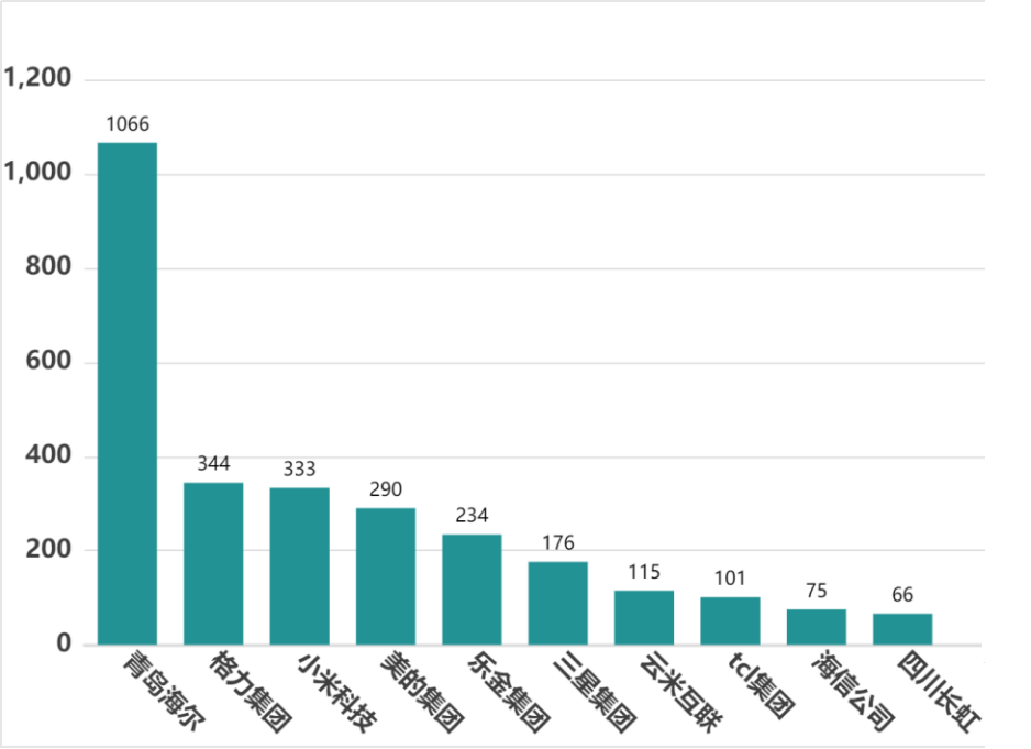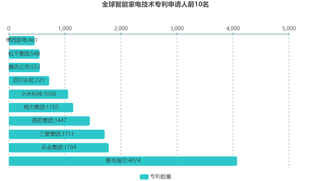全球智能家电专利数量排名前10的申请人中,海尔的专利数量明显多于其他申请人,超过4000件,这显示了海尔在智能家电领域的强大研发实力和创新能力。