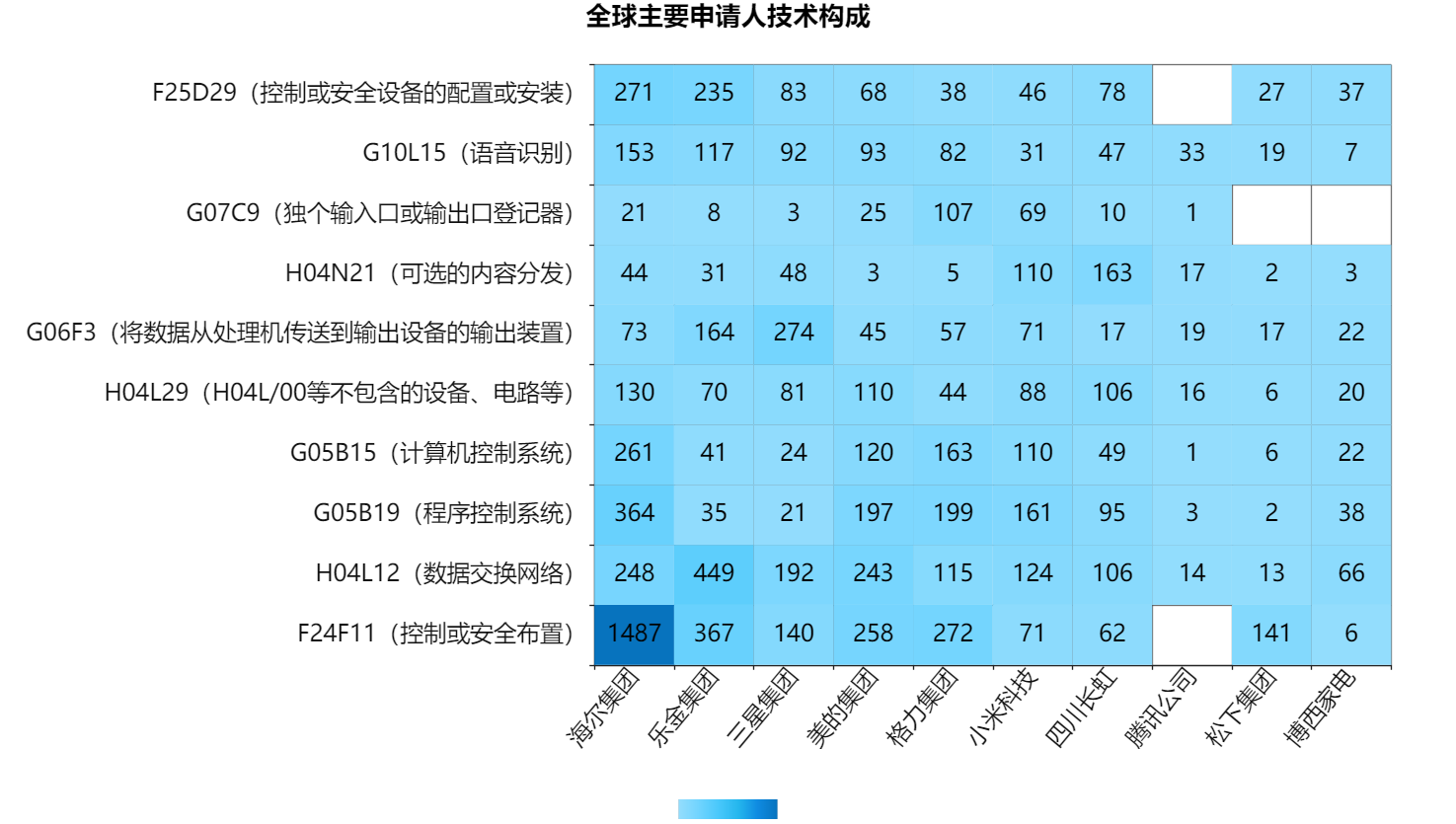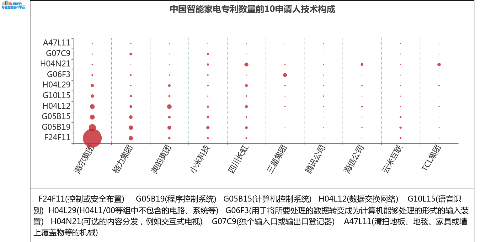 上图可以看出,海尔具备最强的研发实力,在每个技术分支上的专利数量均较多,且海尔的研发侧重点在F24F11(控制或安全布置)技术分支上,拥有1487件专利,远远领先于其他企业。同时,海尔在G05B19(程序控制系统)上有364件专利,在F25D29(控制或安全设备的配置或安装)上有271件专利,在G05B15(计算机控制系统)上有261件专利,在H04L12(数据交换网络)技术分支上有248件专利,该几个技术分支也是海尔的优势技术。此外,还在G10L15(语音识别)和H04L29(H04L1/00等单个组中不包含的设备、电路等)技术分支上分别拥有153和130件专利,数量相差不多。表明海尔在除控制和安全布置技术之外的其他技术分支上也投入了较多研发精力,以保持企业在智能家电技术领域的均衡发展。