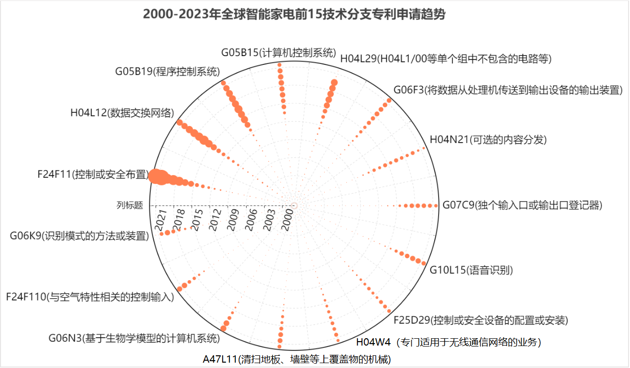 排在4-11位的技术分支占比较为均衡,其中,G05B15(计算机控制系统)、H04L29(H04L1/00等单个组中不包含的装置、设备、电路、系统等)和G06F3(用于将所要处理的数据转变成为计算机能够处理的形式的输入装置)占比均在4%以上,表明硬件系统和软件系统,网络通信设备、路由器、交换机等使用特定通信协议进行数据传输的设备,与数据库管理和文件系统结构相关的软件或系统为智能家电技术领域的研发热点。H04N21(可选的内容分发,例如交互式电视等)、G07C9(独个输入口或输出口登记器)、G10L15(语音识别)、F25D29(控制或安全设备的配置或安装)、H04W4(专门适用于无线通信网络的业务)占比均在3%-4%之间,表明上述技术分支为智能家电技术领域的研发次热点。