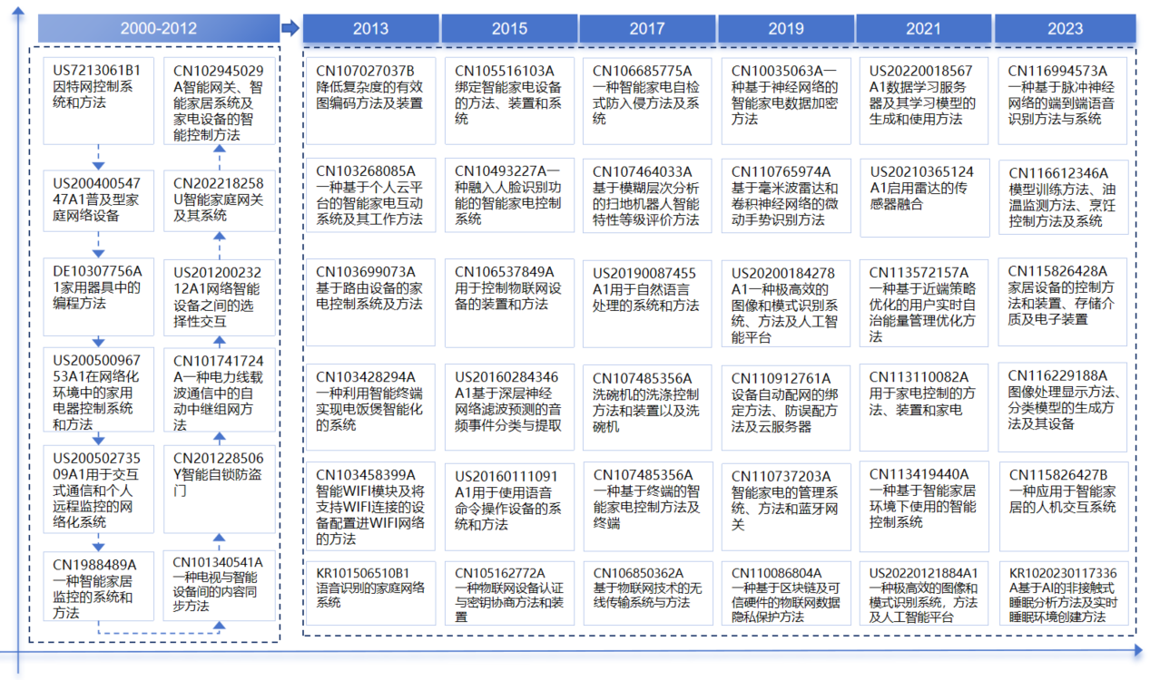 上述次热点技术分支在智能家电领域的具体应用包括:用于实现交互式功能的软件平台,包括用户与电视系统的交互,如电子节目指南(EPG)、视频点播(VOD)、网络浏览等;将语音信号转换为文本或命令的软件模块;访问控制系统,如读卡器(如RFID、条形码、磁卡等)、控制单元(验证权限、记录日志等)和执行器(如门锁、闸机等);用户识别设备,如指纹识别器、面部识别摄像头等;无线基站,包括收发器、天线、信号处理单元等,用于在无线通信网络中传输和接收信号,用于与无线基站进行通信的手机、平板电脑、物联网设备等;用于处理无线网络的业务和数据传输的核心网络设备,如交换机、路由器、服务器等;前述所有硬件模块的配置或安装。