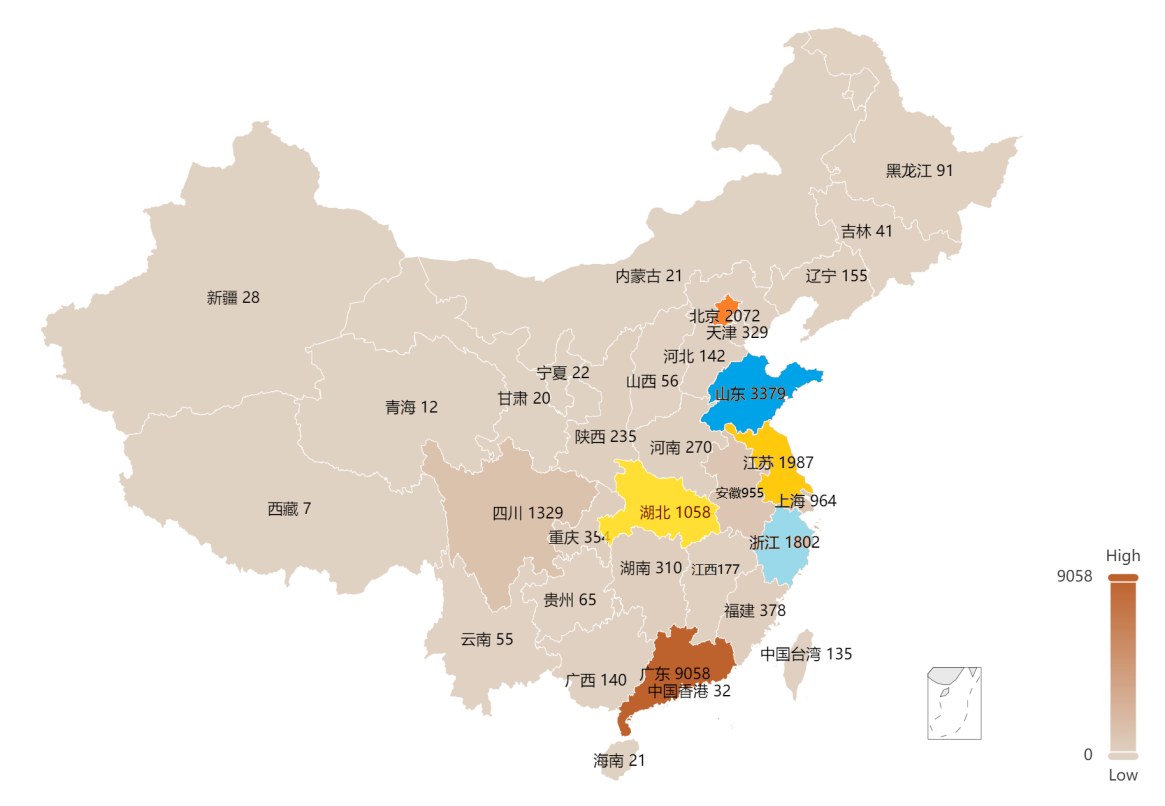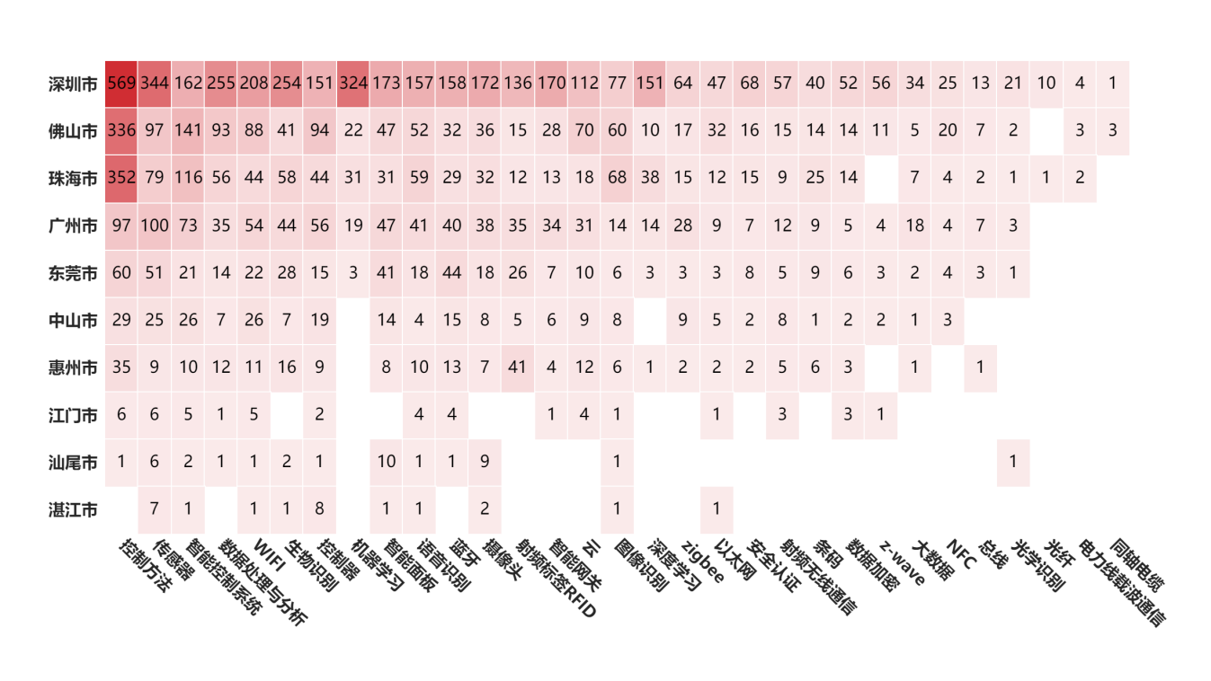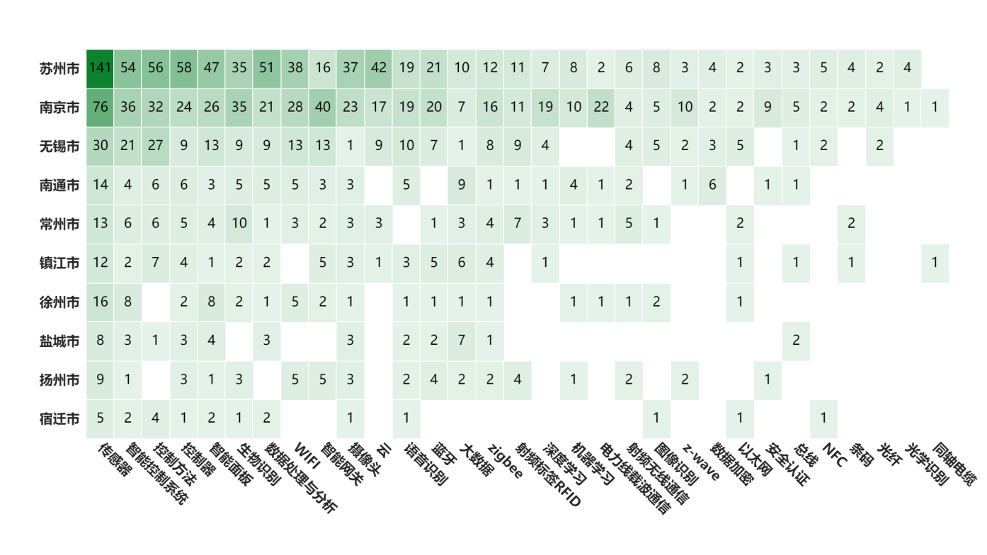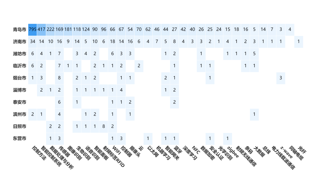 中国是全球智能家电第一大技术来源国,家电专利申请量占全球智能家电专利总申请量的约69%,在智能家电产业行业具有强大研发实力和创新能力。从全国范围来看,专利总数排在前4的省份中,广东省智能家电专利布局整体呈现出技术全面、热点集中、多样性强、深度研究和地域扩散的特点,排名前十城市中有一半以上的城市专利布局接近完善。山东省智能家电专利布局主要集中在青岛市和济南市,尽管地域扩散度较差,但该两个城市的专利布局非常完善,尤其是青岛市,在控制方法、智能控制系统上的技术优势非常明显,远超广东深圳,显示出强大的研发能力和技术积累。北京市和江苏省的智能家电布局在各个城市较为分散,但总体上呈现出分别以海淀区和苏州市为中心,向其他城市扩散的局面,展现出较强的研发实力和较为均衡的技术发展。湖北省智能家电专利布局则主要以武汉市为主,但不管是武汉市还是其他城市,总专利数量较少,且武汉以外的其他城市专利涉及的技术分支也较少,总体来看,智能家电产业创新力量都集中在武汉,湖北省其他城市还处在初期发展阶段。
