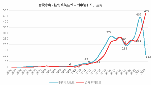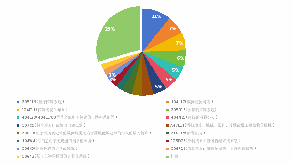 技术方面,基于前述图1-8的分析,与物联网三层架构感知层、网络传输层和应用层相对应的技术分支对应的研究热点包括以下几大热点:F24F11(控制或安全布置)、H04L12(数据交换网络)、G05B19(程序控制系统)、G05B15(计算机控制系统)、H04L29(H04L1/00等单个组中不包含的装置、设备、电路、系统等)、G06F3(用于将所要处理的数据转变成为计算机能够处理的形式的输入装置)、H04N21(可选的内容分发,例如交互式电视等)、G07C9(独个输入口或输出口登记器)、G10L15(语音识别)、F25D29(控制或安全设备的配置或安装)、H04W4(专门适用于无线通信网络的业务)。总体上,自主、便利和安全是智能家电近些年发展的主要内容。基于图1-9至图1-11的分析,智能大家电中的智能空气调节电器和智能清洁电器是主要研发对象,智能小家电中安全报警电器是主要研发对象,主要技术分支上,控制方法、传感器、语音识别、智能控制系统、生物识别、控制器和数据处理与分析是最主要研究热点。