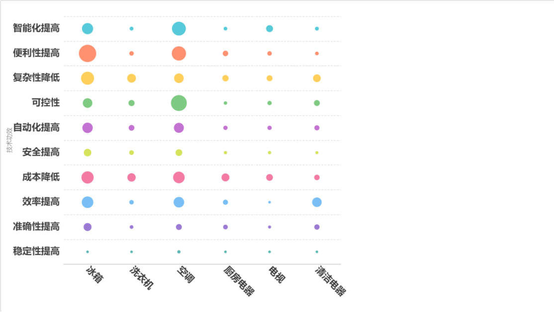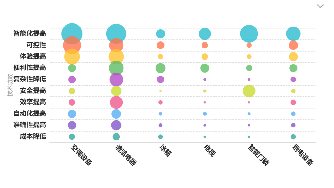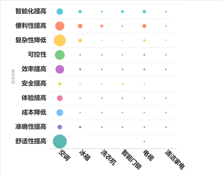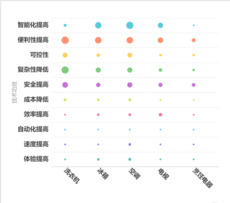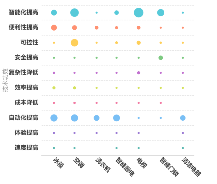 对全球智能家电设备的所有专利的主要技术功效进行汇总分析,目前智能大家电中各类智能家电设备应用场景不同,其聚焦的技术功效也各有侧重。