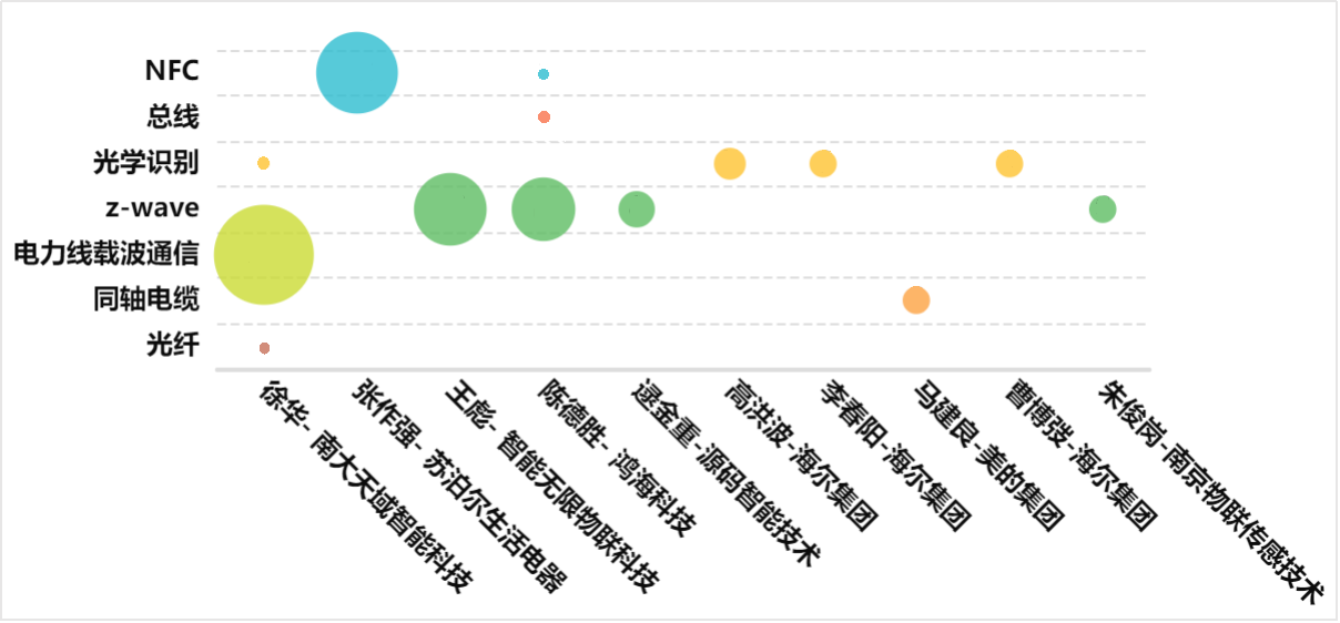 光纤技术主要为智能家居中用电设备提供稳定且高速的网络连接,光纤的使用能减少电磁辐射,有助于用电设备的节能环保,同时其高效的传输效率也有助于降低能源消耗。但是如前所述,光纤技术成本较高,难以小型化和集成化到家电设备上,且其技术成熟度可能较高,因此传统家电企业并未投入过大研发精力在该技术分支上。当前可关注布局有少量专利的南京南大天域智能科技的徐华及其团队。