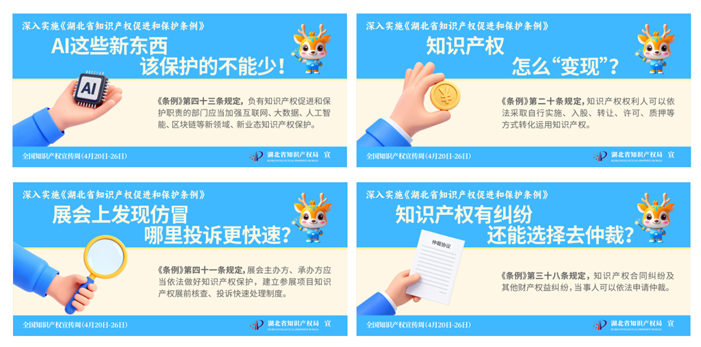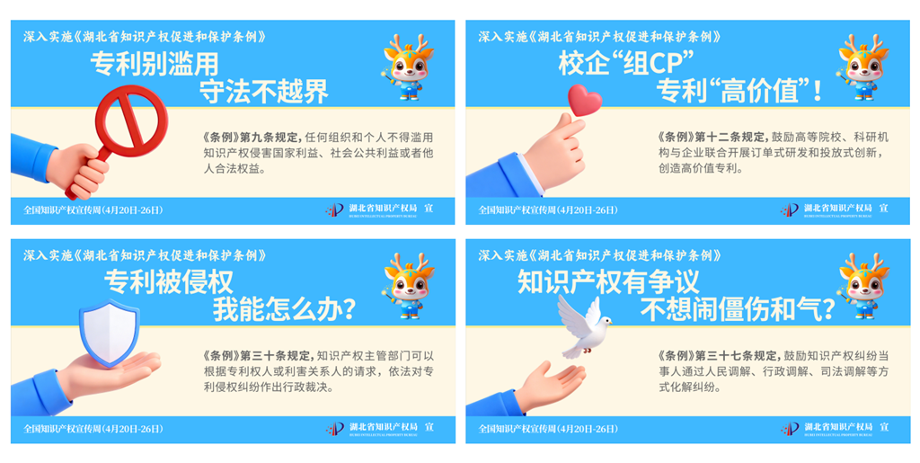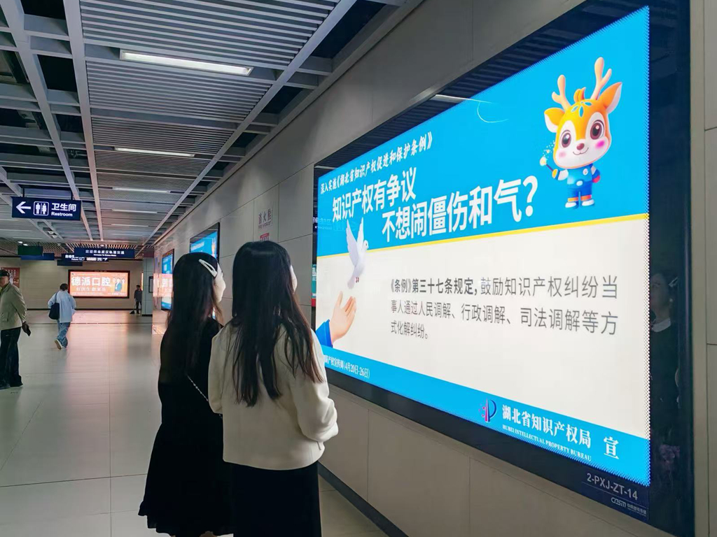 为深入实施《湖北省知识产权促进和保护条例》,迎接全国知识产权宣传周,湖北省知识产权局在武汉地铁洪山广场、水果湖、洪山路、螃蟹岬等站点,自4月3日至5月5日,开启为期一个月的《条例》集中宣传活动。